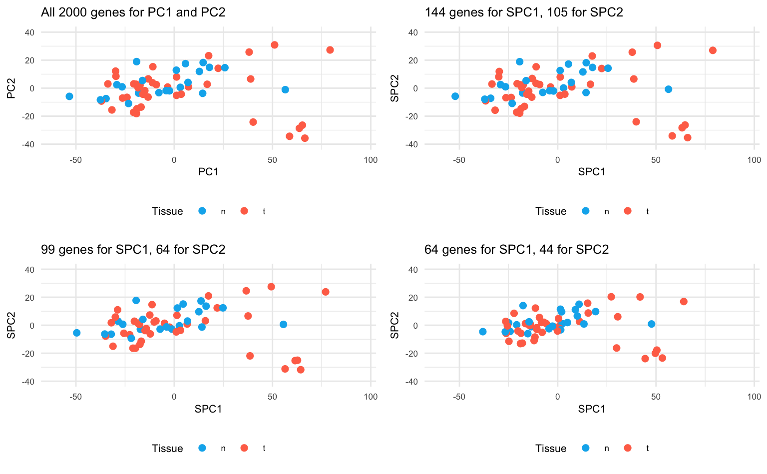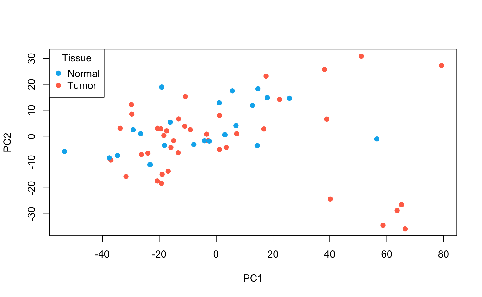 Interpretation: using only the first 2 PCs does not seem to separate the tumor and normal cases clearly.