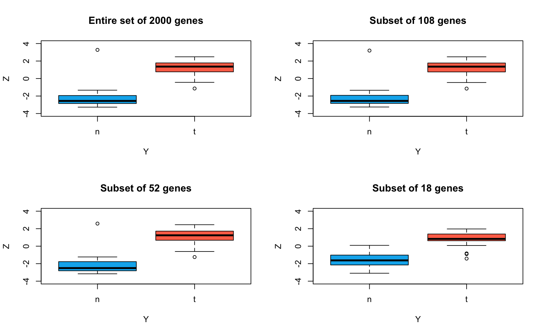 The goal of this practical is to find the best subset / combination of genes to detect tumourous tissue. As in Alon et al. (1999), we use the 2000 genes with the highest minimal intensity across the samples.