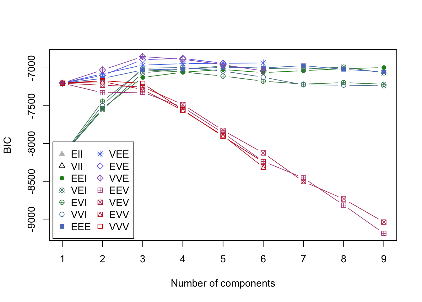 #> BIC diff 0.000 -2.322571 -6.310357A five-component mixture with diagonal covariances having equal shape, but varying volume (VEI), results in the highest BIC.