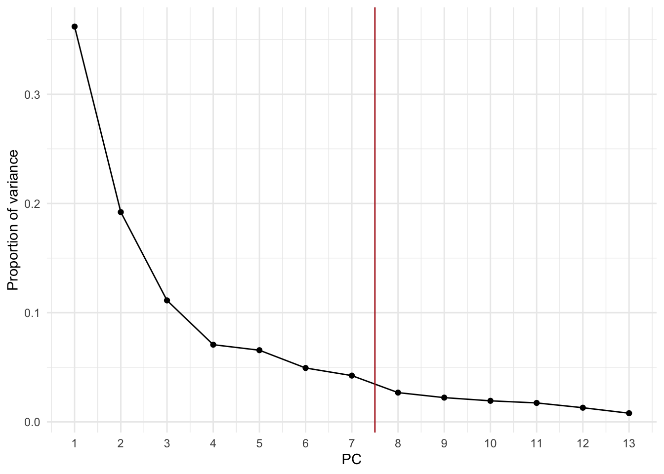 The first 7 PCs explain about 92% of the variance in the wine data.