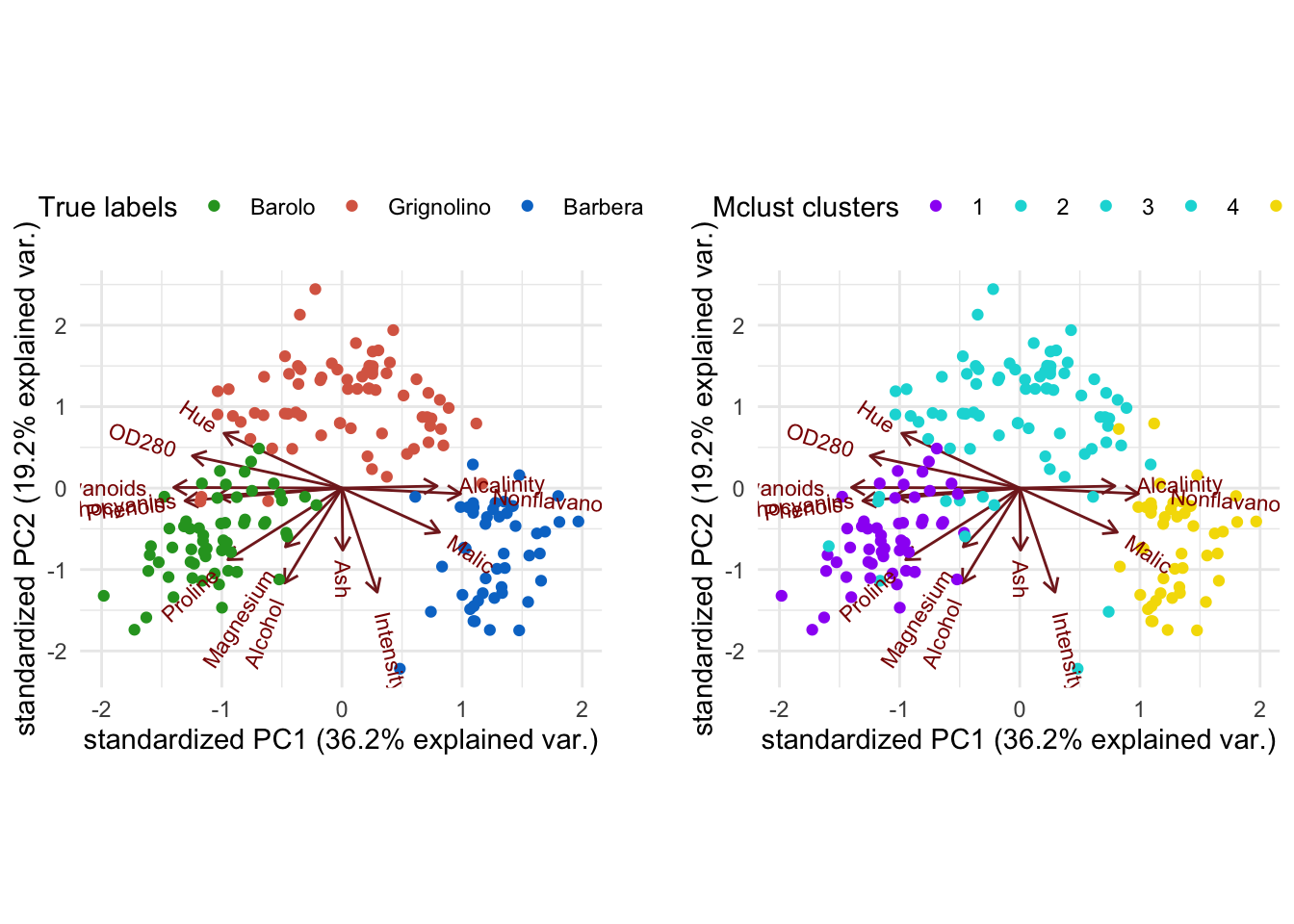 mclust::Mclust() to perform model-based clustering on the wine data.mc <- Mclust(X)