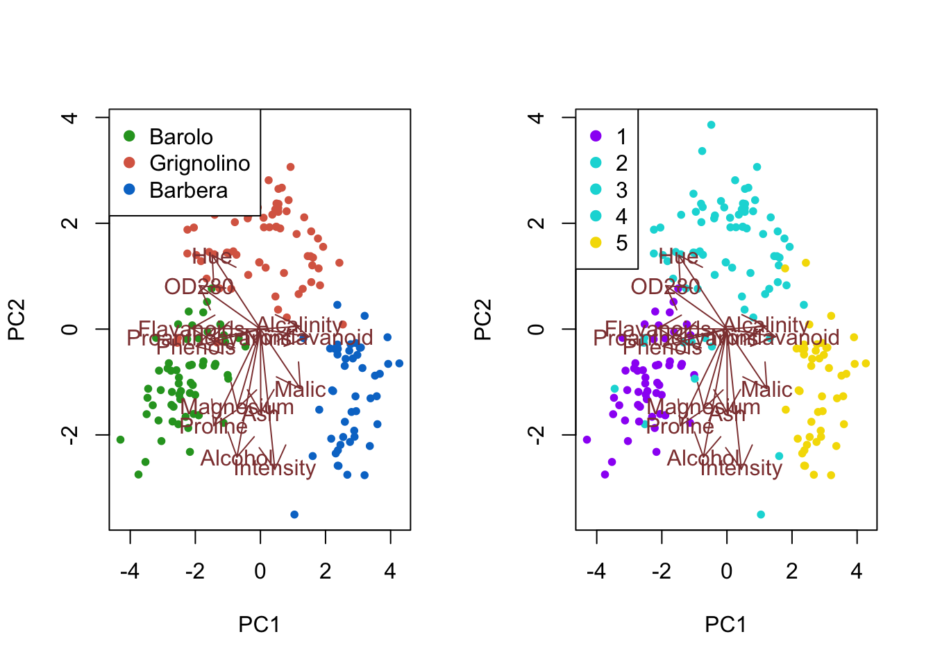 Interpretation: Low values on PC1 correspond to heavier, aged, more structured wines, while high values indicate fresher, less heavy, younger wines. High values on PC2 correspond to lighter-colored wines with lower alcohol content. Importantly, the three classes are quite clearly visually separated with little overlap between them. We can thus rely on the biplot to visually investigate how well a clustering algorithm recovers the true classes.