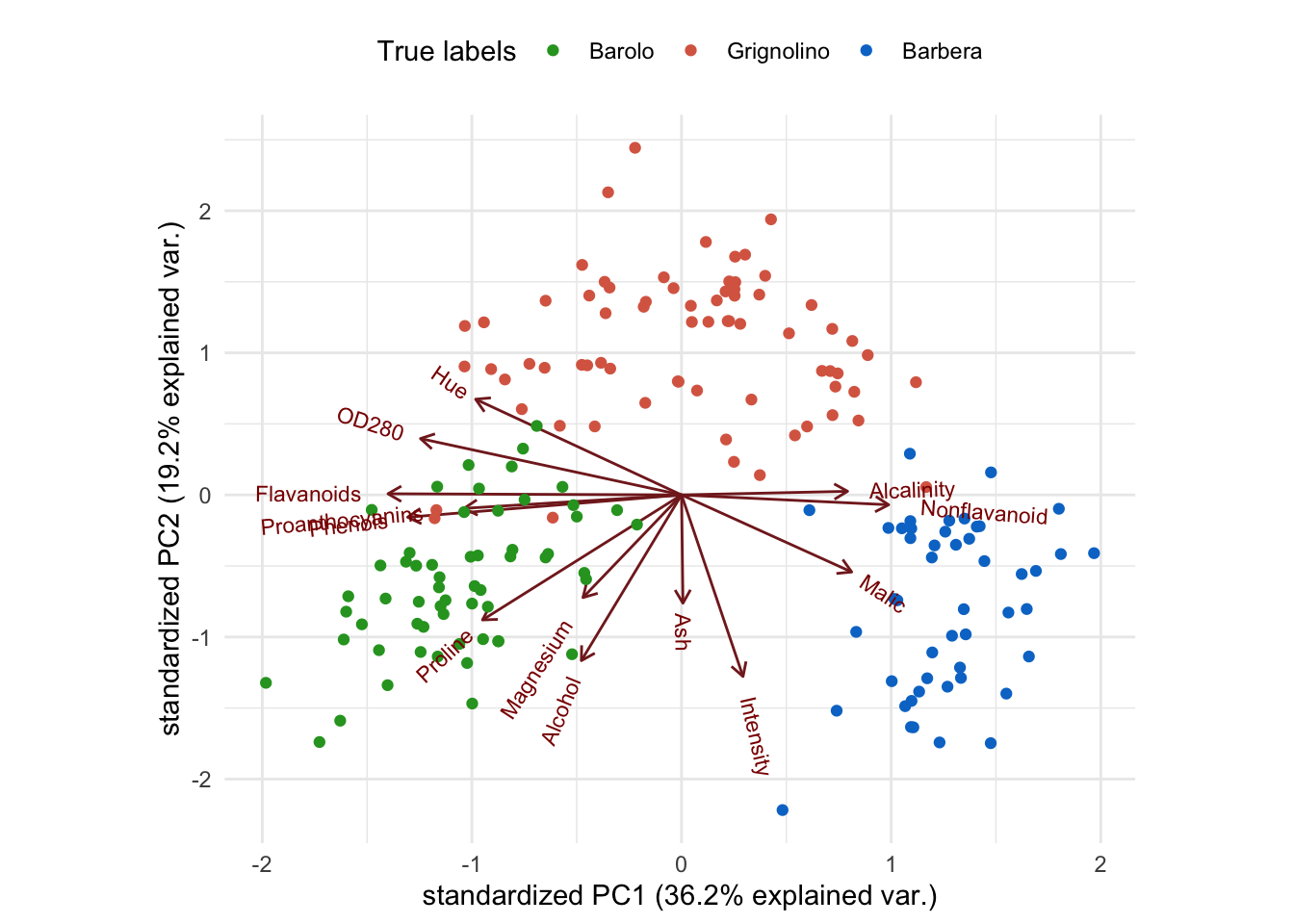 #> Barbera 0 21 27Biplot with ggbiplot: