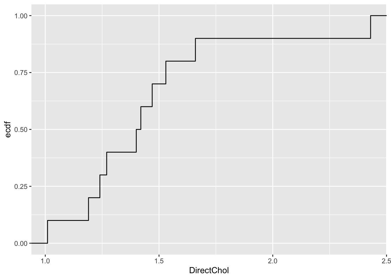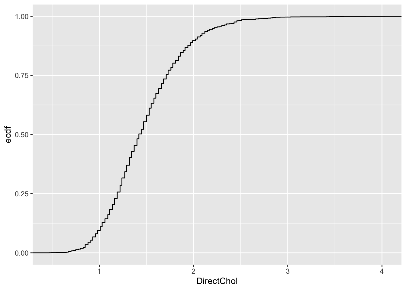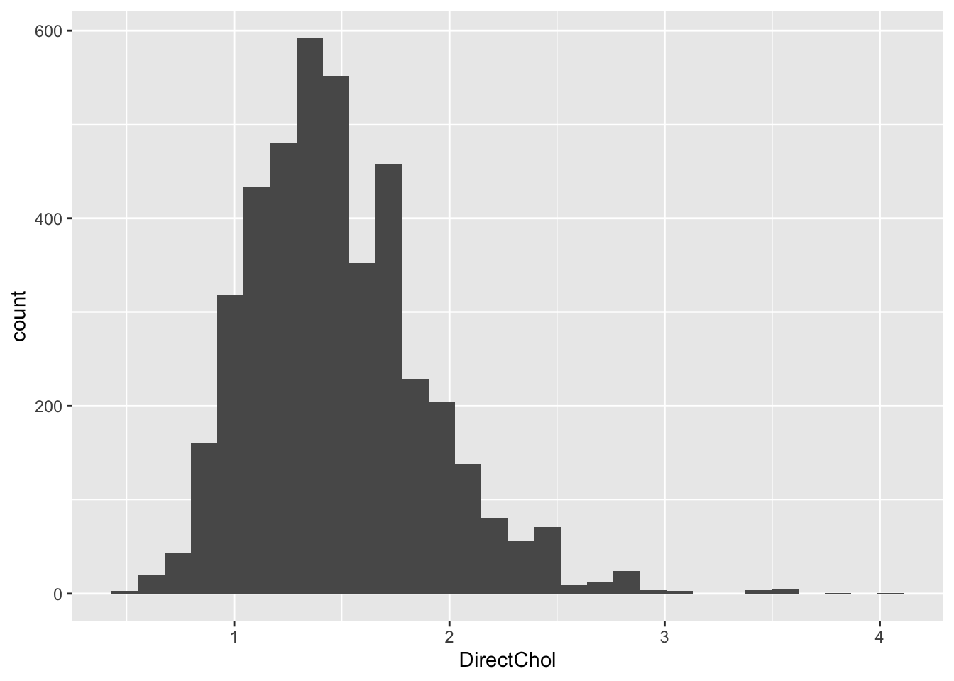 In the introduction we have seen that the log transformed direct cholesterol levels had a nice bell shape.