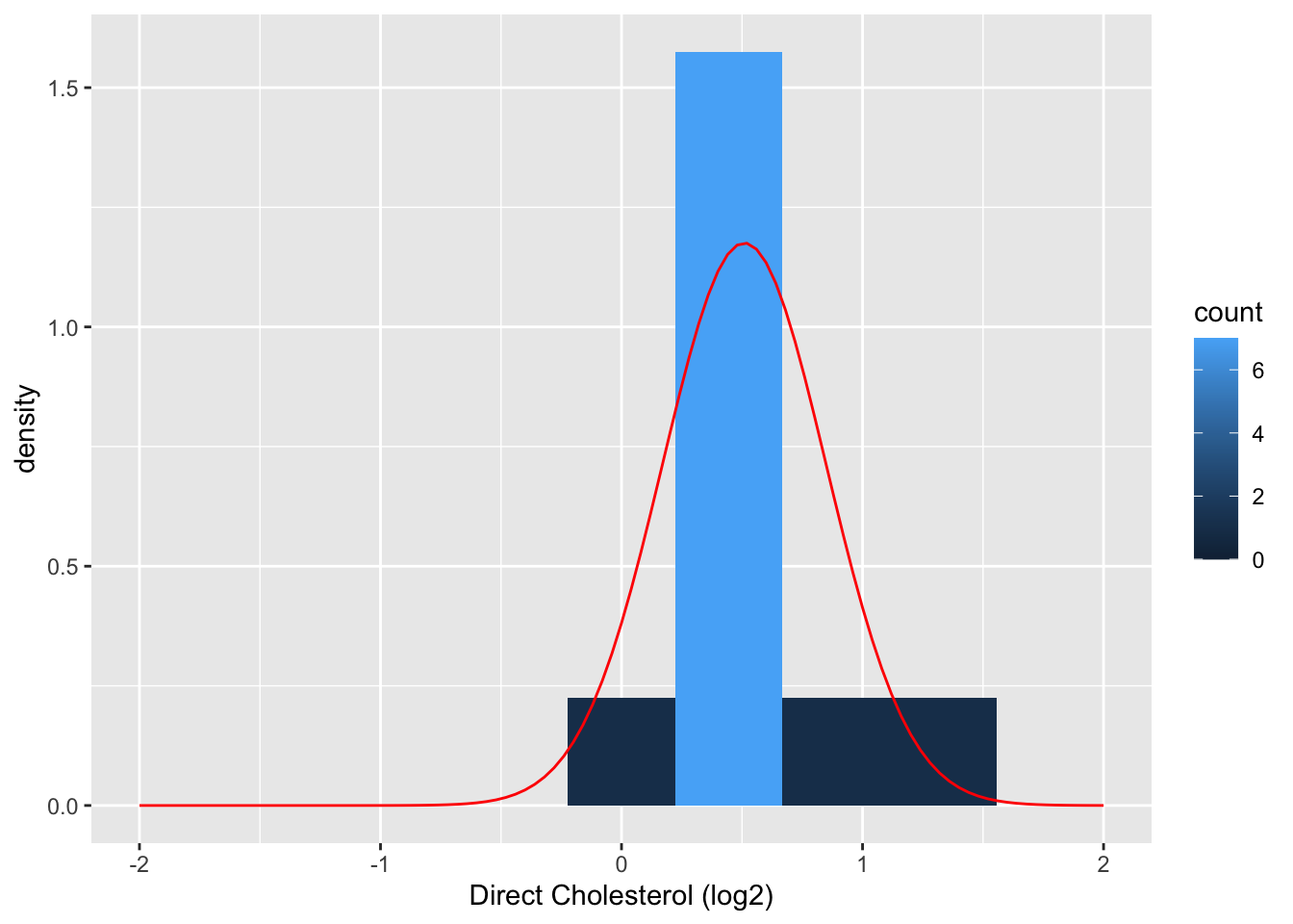 fem %>%ggplot(aes(x = DirectChol %>%log2())) +geom_histogram(aes(y = ..density.., fill = ..count..)) +xlab("Direct Cholesterol (log2)") +stat_function(fun = dnorm, color ="red", args =list(mean =mean(fem$DirectChol %>%log2()), sd =sd(fem$DirectChol %>%log2())))