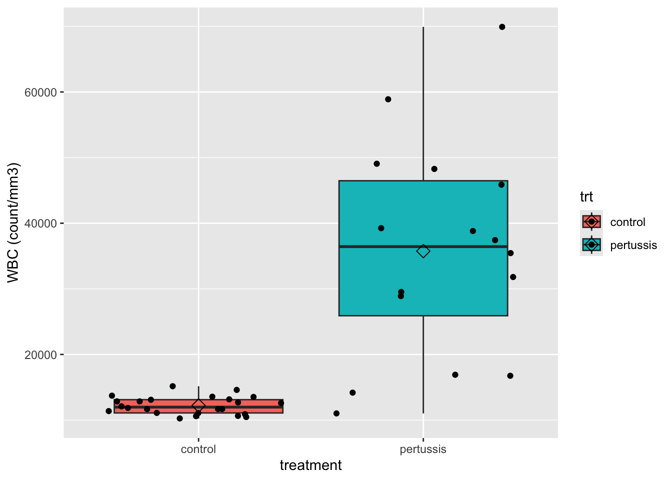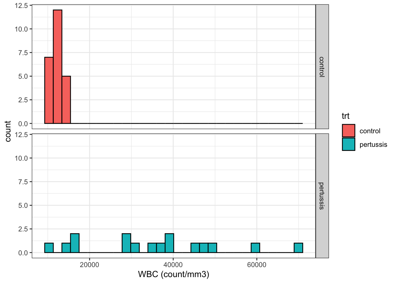 We will explore the data to get insight on the impact of the pertussis infection on the white blood cell count.