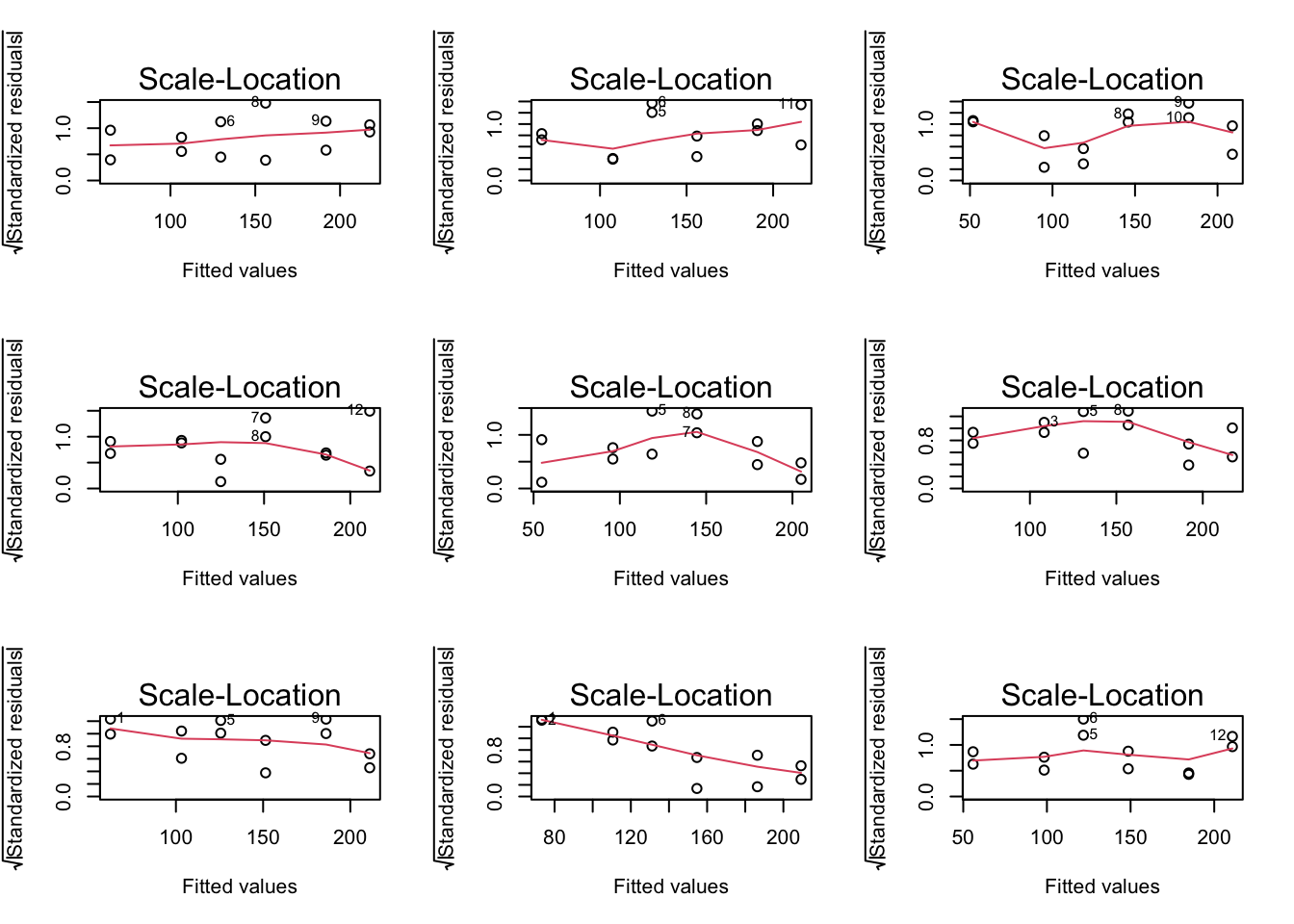 We can again use the residual plot for assessing this assumption or the plot were we plot the square root of the standardized residuals in function of the fit.