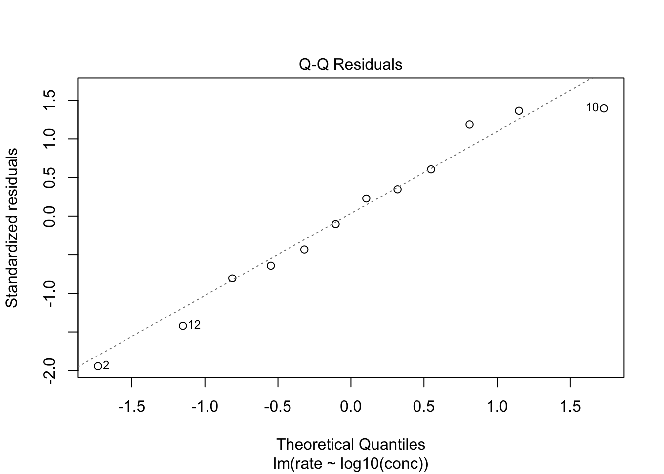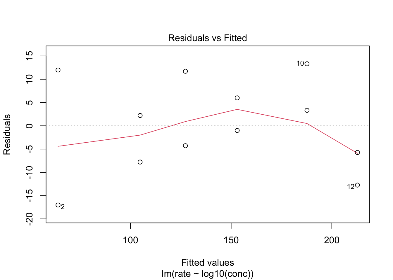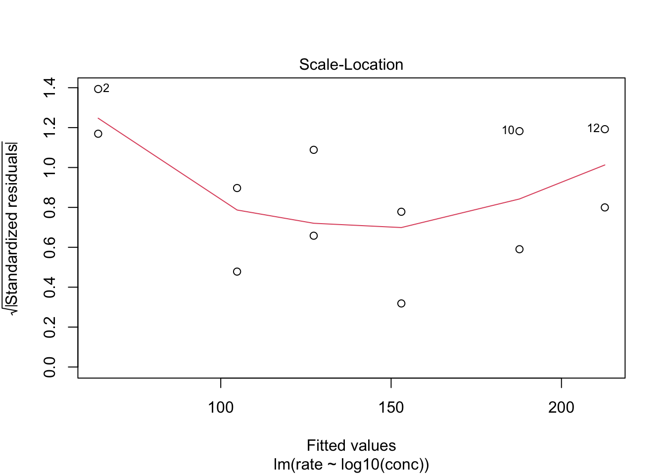 We see that the spread of the majority of the residuals is more or less similar. However, the two residuals at low concentrations are slightly higher.