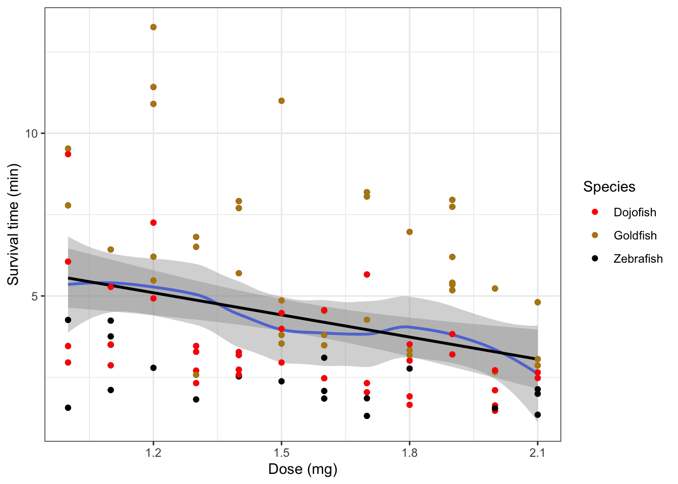 the dose and the survival time. Additionally, add the fish species