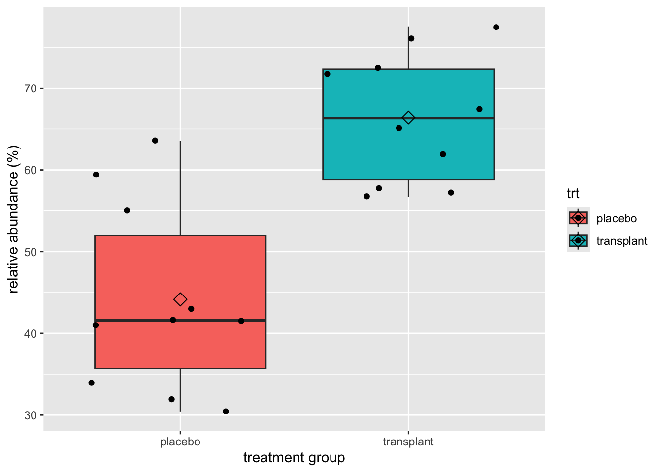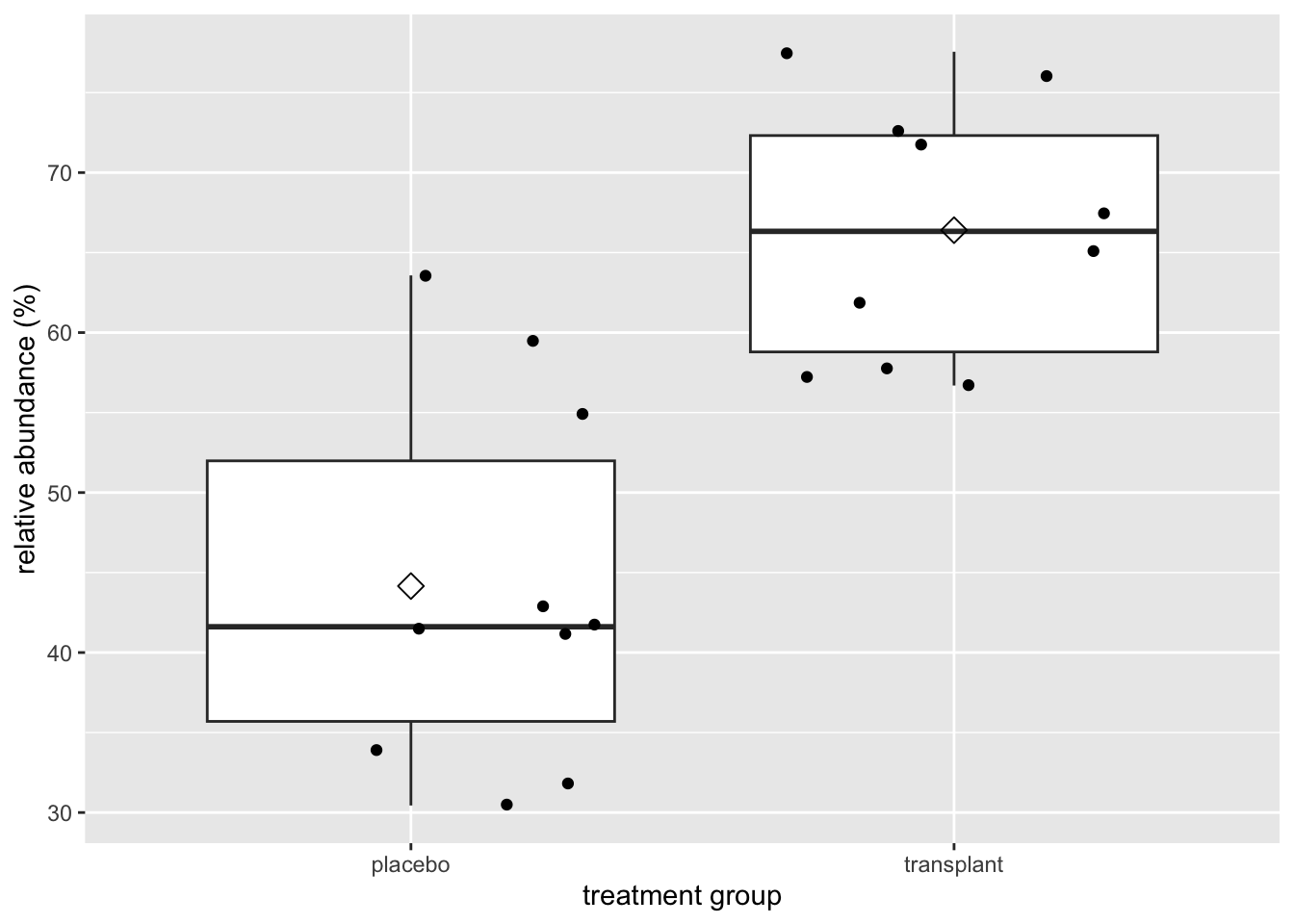 On average the relative abundance of Staphylococcus spp. in the microbiome of the armpit in the transplant group is extremely significantly different from that in the placebo group (\(p<<0.001\)). The relative abundance of Staphylococcus spp. is on average 22.2% larger in the transplant group than in the placebo group (95% CI [13.0,31.5]%).