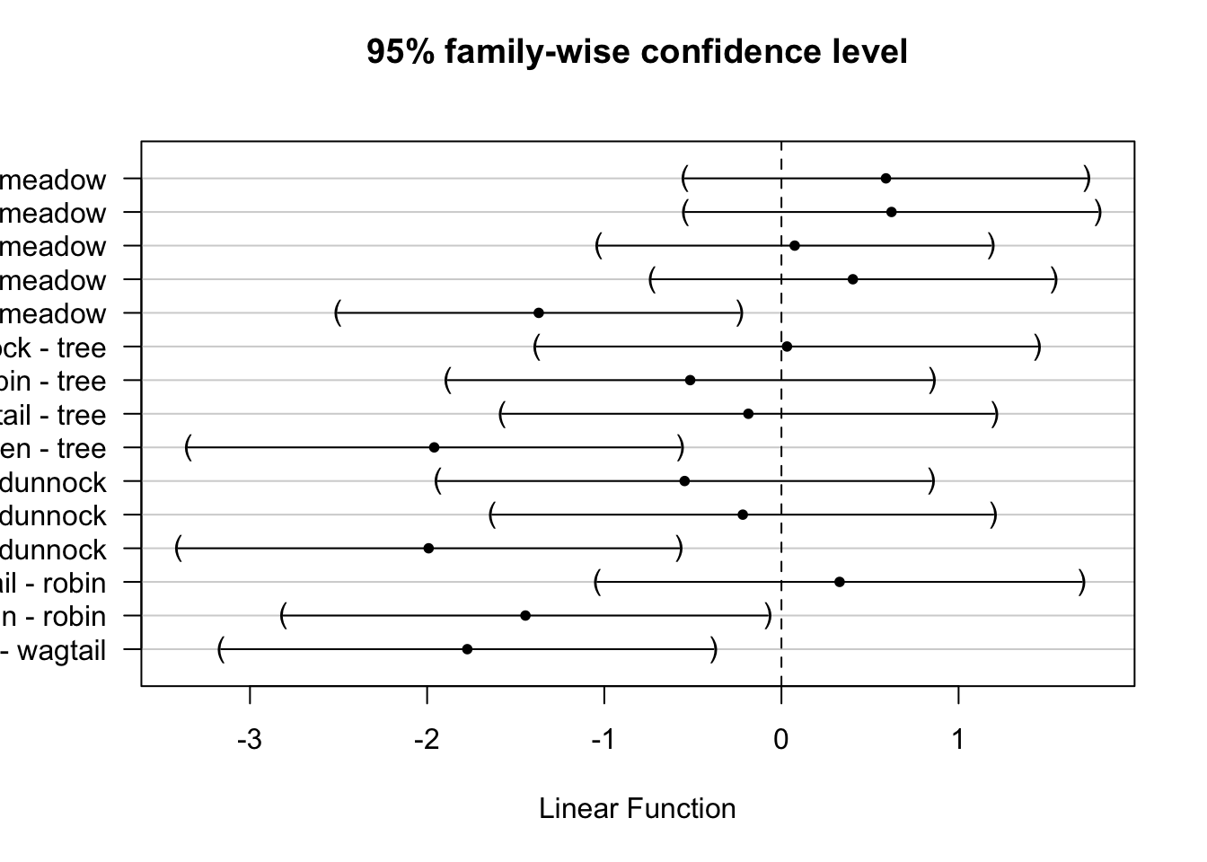 ## wren - robin == 0 -1.44500 0.47330 -3.053 0.03198 *