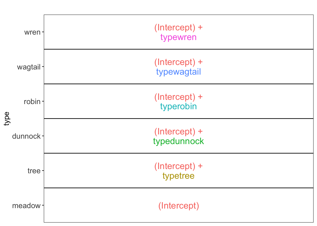 i.e. the intercept. If egg \(i\) was fostered by the European robin (type 4), we would have: