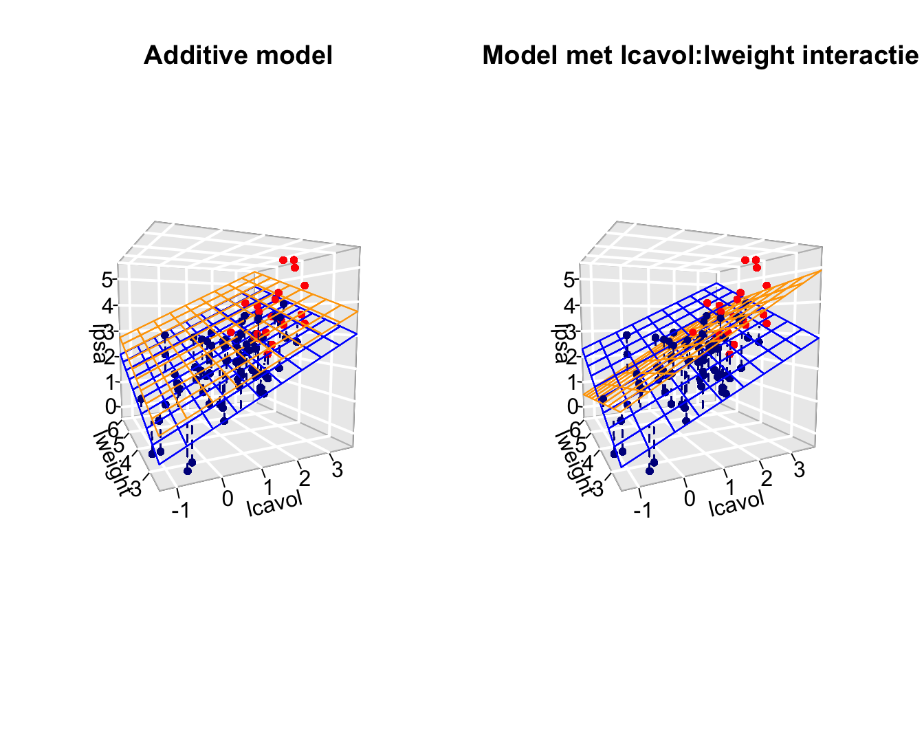 The svi status and the log-prostategewicht (\(x_w\)) do not influence the contribution of the log-tumor volume (\(x_v\)) to the average log-PSA and vice versa.