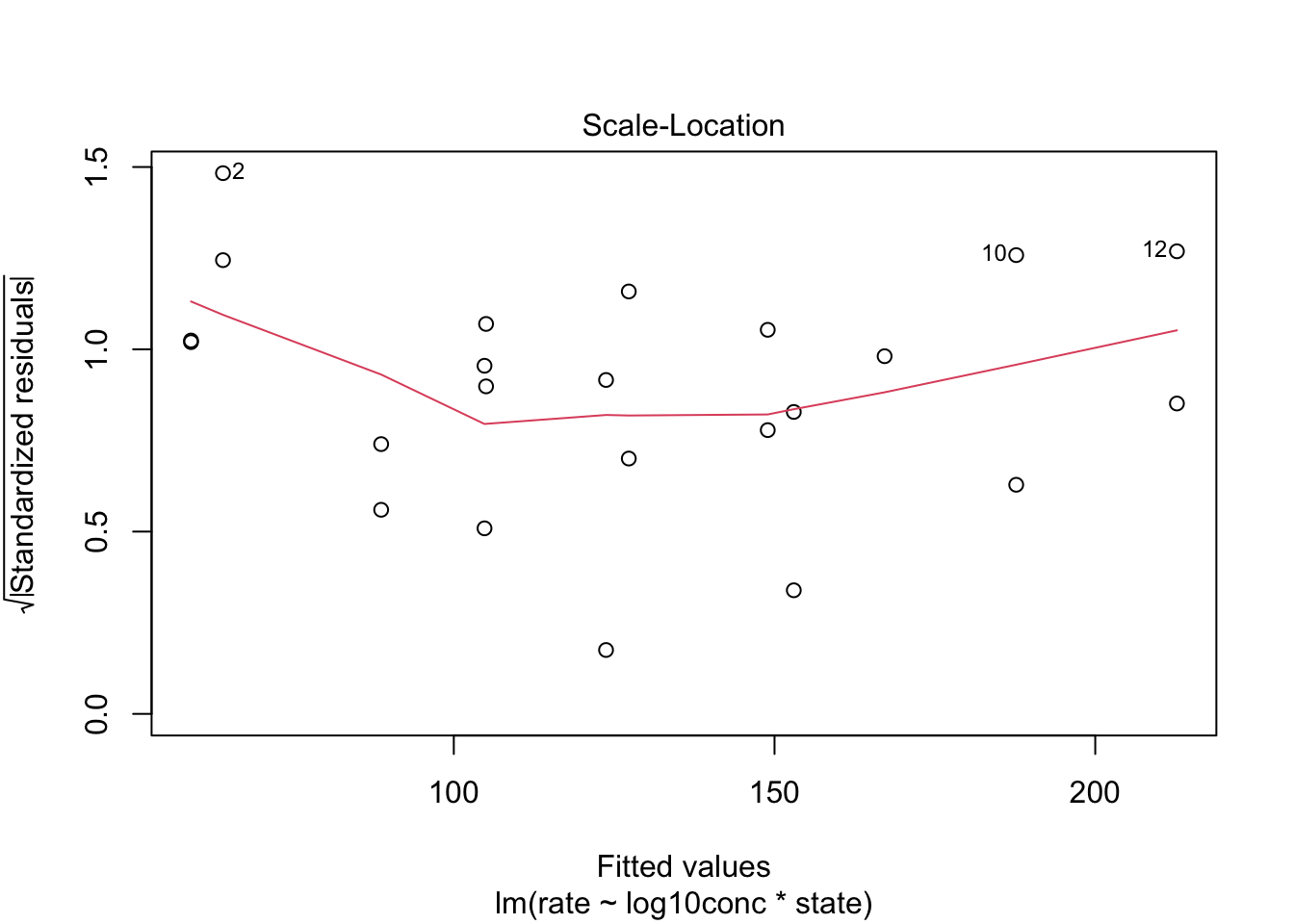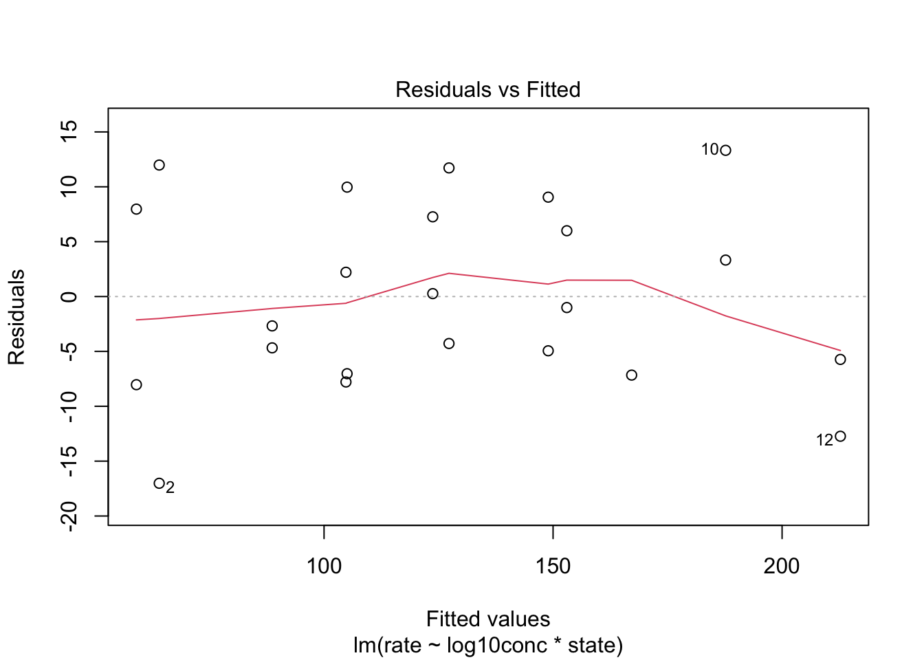 ## lm(formula = rate ~ log10conc + state, data = Puromycin)