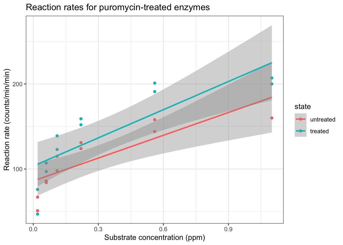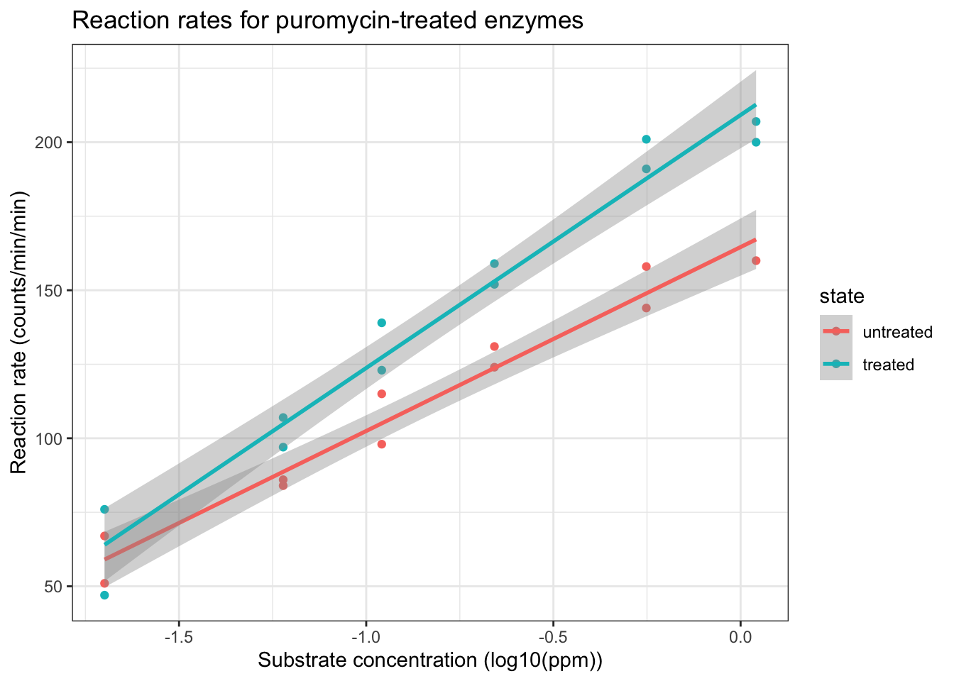 ggtitle("Reaction rates for puromycin-treated enzymes")
