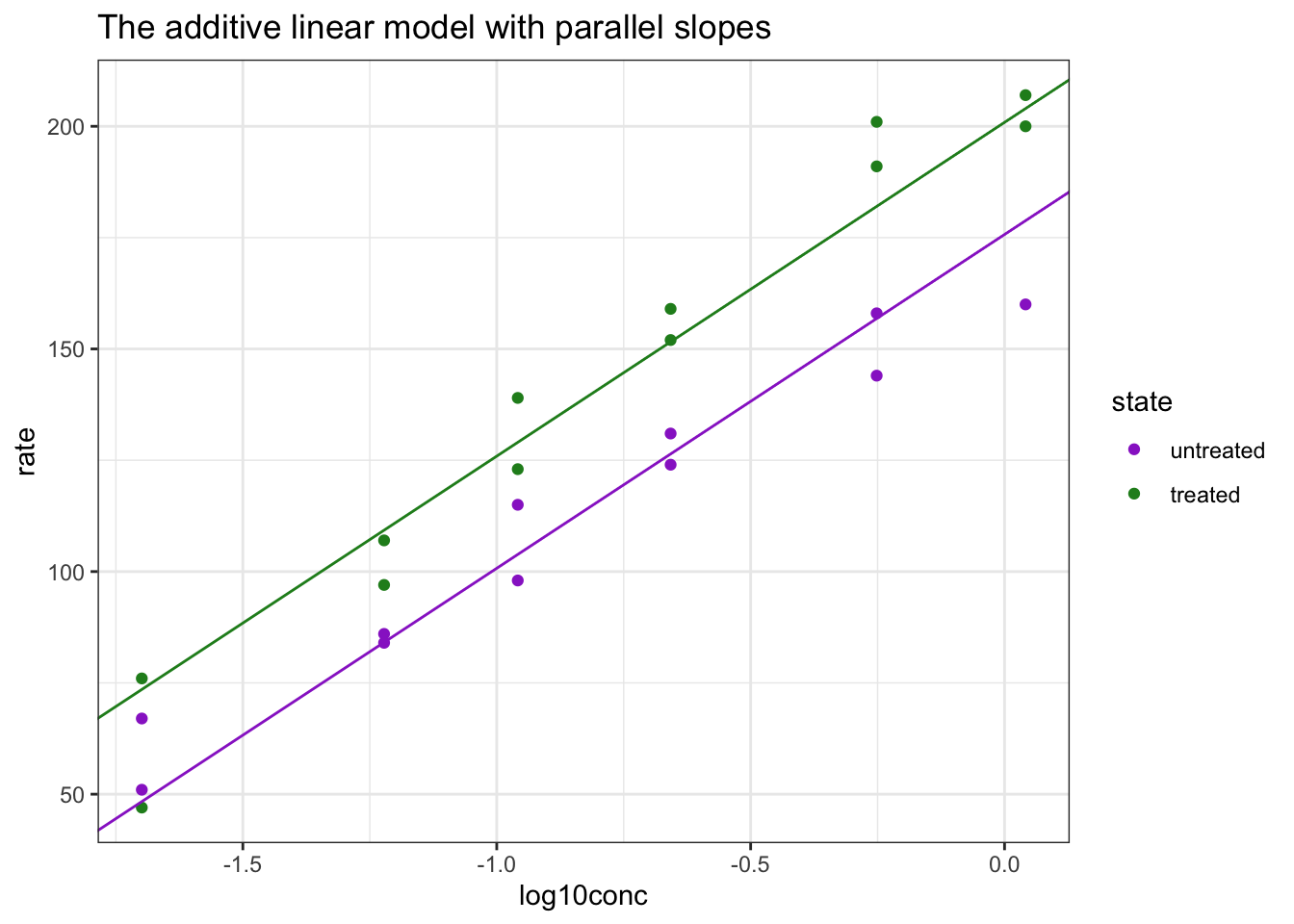 mod_add <- lm(rate ~ log10conc + state, data = Puromycin)