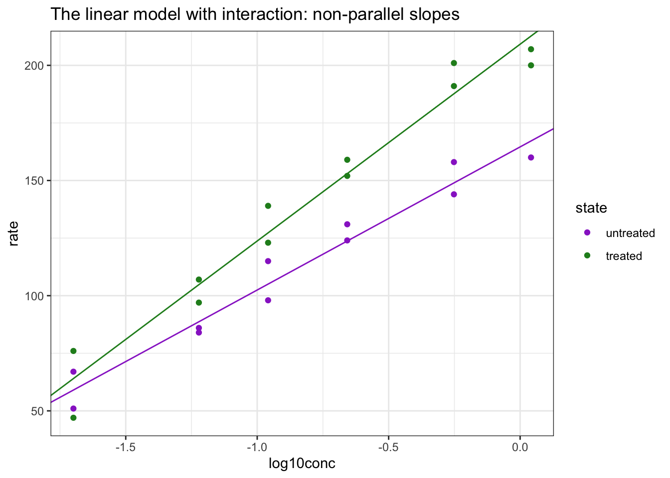 The interaction term has the interpretation as the change in slope between treated and untreated samples.
