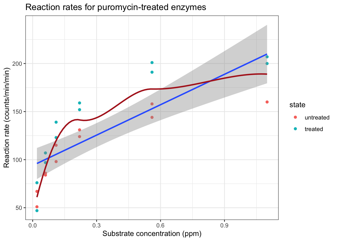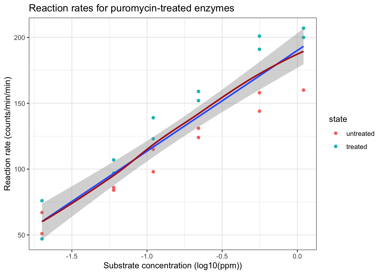 ggtitle("Reaction rates for puromycin-treated enzymes")