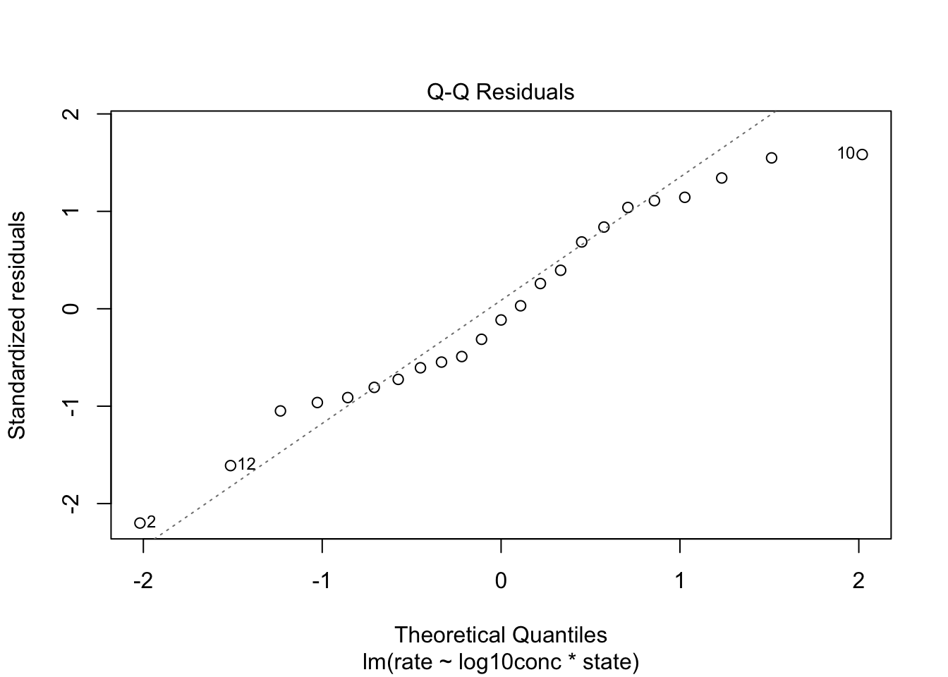 ## Fit: lm(formula = rate ~ log10conc * state, data = Puromycin)