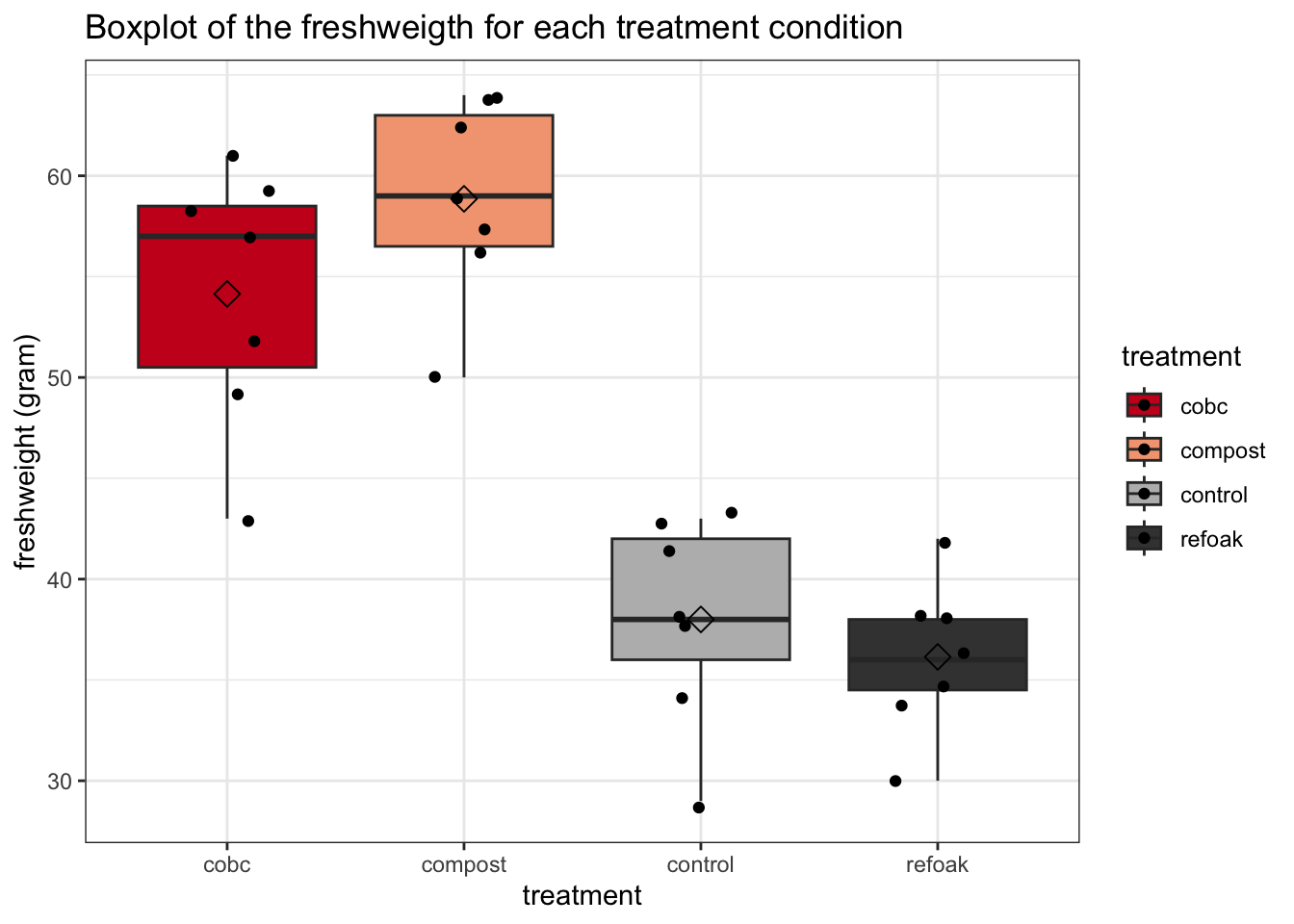Now let’s make a boxplot displaying the freshweight