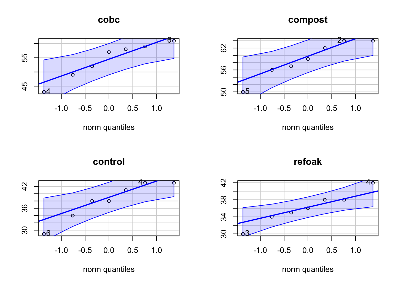 qqPlot(subset(lettuce, treatment == i)$freshweight, main = i, ylab = "")