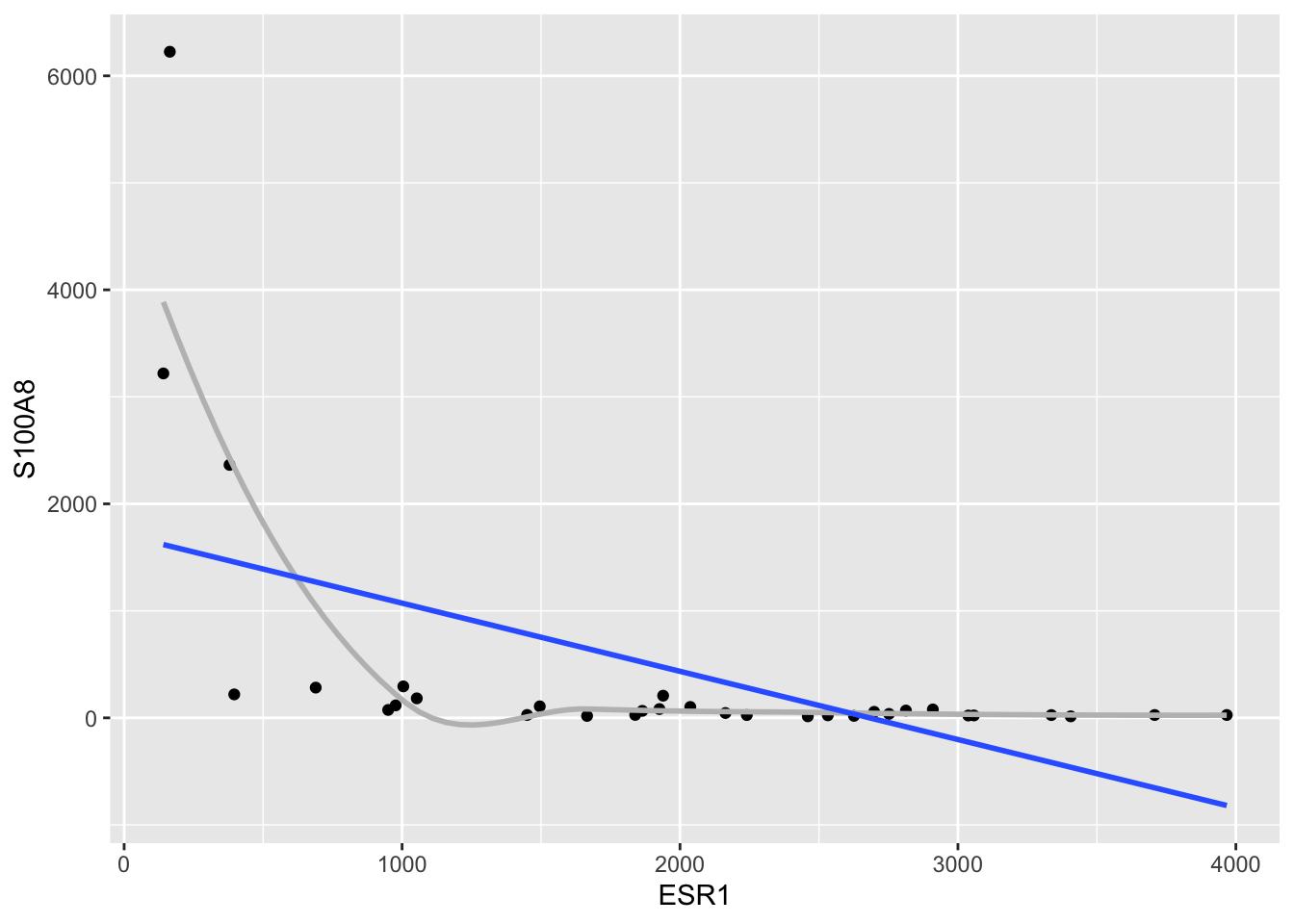 ggplot(aes(x = ESR1, y = S100A8)) +