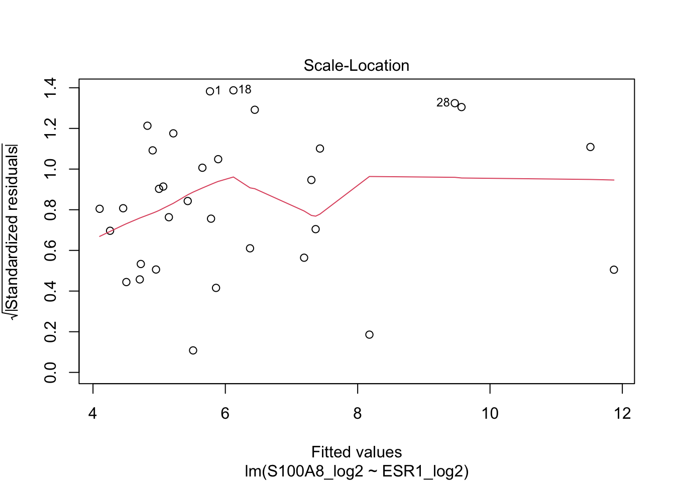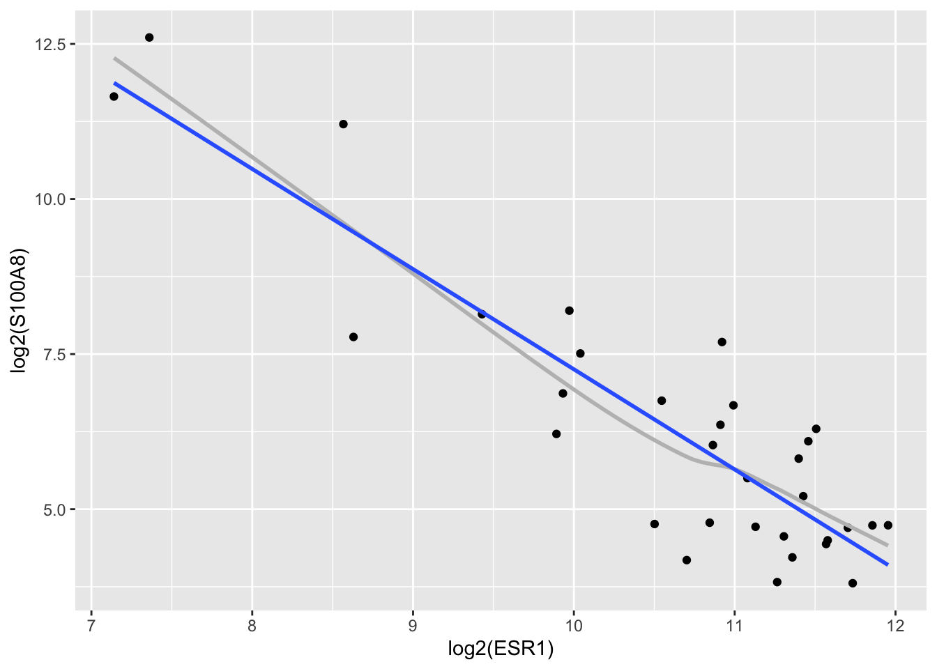 with \(Y_i\) the log2 transformed S100A8 gene expression and \(X_i\) the log2 transformed ESR1 gene expression.