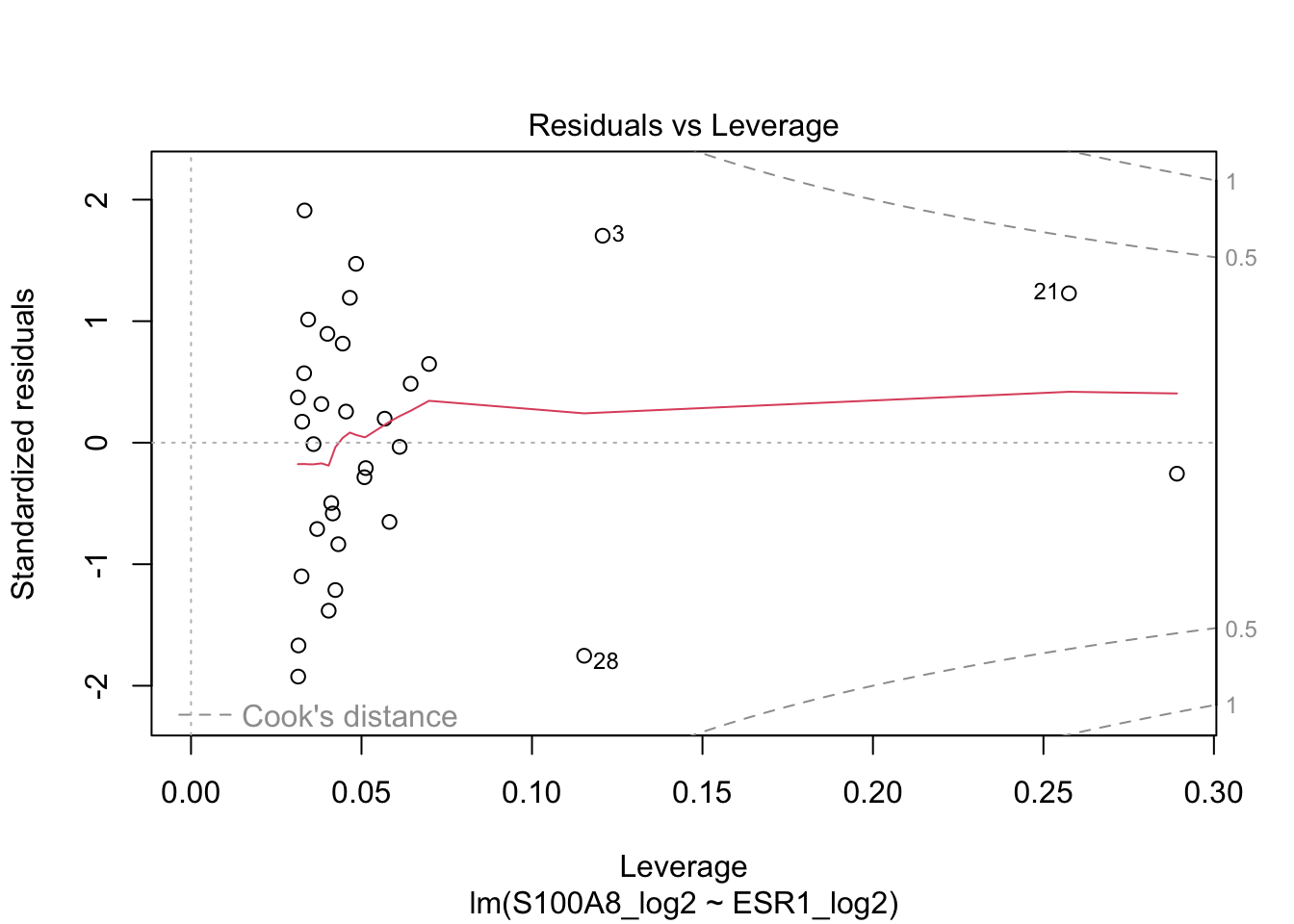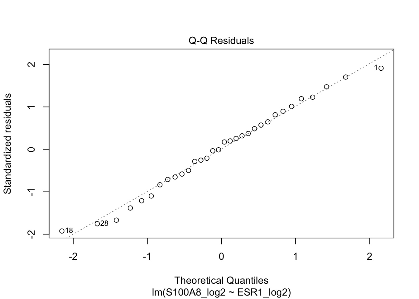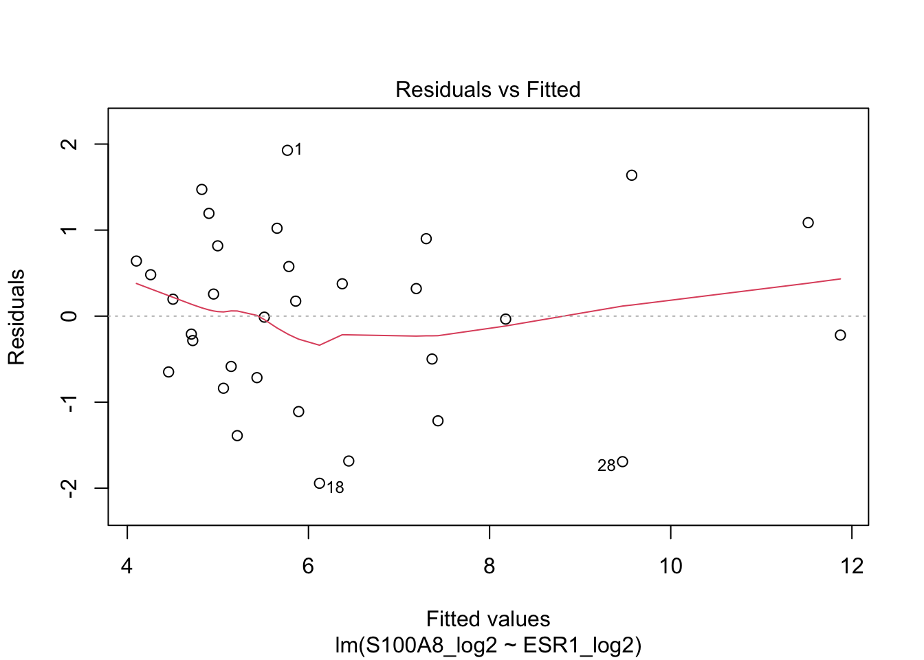 We can now assess a formal hypothesis test to for the linear association between the S100A8 gene and the ESR1 gene expression at the log2 scale.