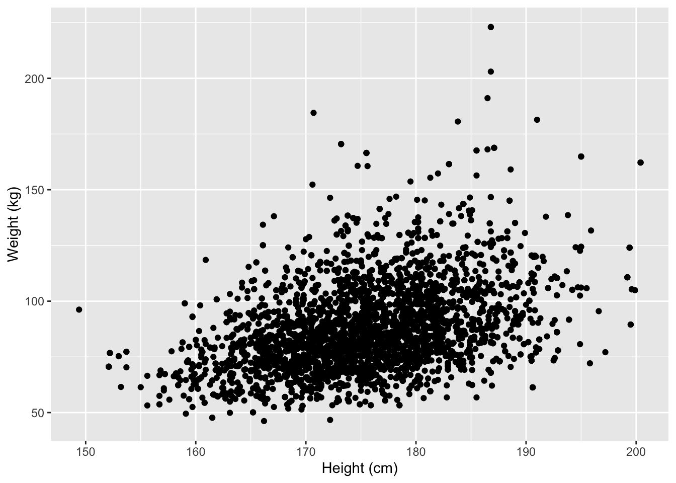 For the NHANES dataset, we can for instance look at the relationship between a person’s height and weigth values.