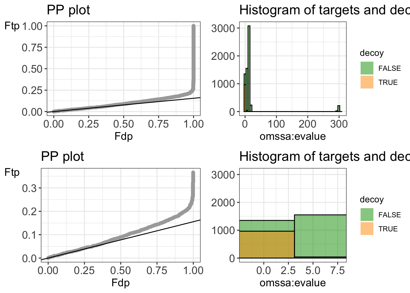 LS0tCnRpdGxlOiAiVHV0b3JpYWw6IEV2YWx1YXRlIHB5cm9jb2NjdXMgc2VhcmNoZXMgdXNpbmcgU3dpc3Nwcm90IGFuZCBwZXB0aWRlIHNoYWtlciIKYXV0aG9yOiAKICAtIG5hbWU6IExpZXZlbiBDbGVtZW50CiAgICBhZmZpbGlhdGlvbjoKICAgIC0gR2hlbnQgVW5pdmVyc2l0eQpvdXRwdXQ6IAogICAgaHRtbF9kb2N1bWVudDoKICAgICAgY29kZV9kb3dubG9hZDogdHJ1ZQogICAgICB0aGVtZTogZmxhdGx5CiAgICAgIHRvYzogdHJ1ZQogICAgICB0b2NfZmxvYXQ6IHRydWUKICAgICAgaGlnaGxpZ2h0OiB0YW5nbwogICAgICBudW1iZXJfc2VjdGlvbnM6IHRydWUKbGlua2NvbG9yOiBibHVlCnVybGNvbG9yOiBibHVlCmNpdGVjb2xvcjogYmx1ZQotLS0KCiMgTG9hZCBMaWJyYXJpZXMgCgpgYGB7cn0KbGlicmFyeShUYXJnZXREZWNveSkKbGlicmFyeShSQ3VybCkKbGlicmFyeShteklEKQpgYGAKCiMgRG93bmxvYWQgZGF0YSBpbiB3b3JraW5nIGRpcmVjdG9yeQoKYGBge3J9CmRvd25sb2FkLmZpbGUoIAogIHVybCA9ICJodHRwczovL3Jhdy5naXRodWJ1c2VyY29udGVudC5jb20vc3RhdE9taWNzL1BEQTIyR1RQQi9kYXRhL2lkZW50aWZpY2F0aW9uL3B5cm9Td2lzc3Byb3QubXppZCIsCiAgZGVzdGZpbGUgPSAicHlyb1N3aXNzcHJvdC5temlkIgogICkKYGBgCgojIExvYWQgRGF0YSBpbiBSCgpgYGB7cn0KcGF0aDJGaWxlIDwtICJweXJvU3dpc3Nwcm90Lm16aWQiCm16aWRTd2lzc3Byb3QgPC0gbXpJRChwYXRoMkZpbGUpCmBgYAoKIyBMYXVuY2ggdGhlIFNoaW55IEdhZGdldCAKCkV4cGxvcmUgdGhlIHJlc3VsdHMgZm9yIHNlYXJjaCBlbmluZ2Ugc2NvcmVzIHRvIGZpbmQgY29ycmVjdCBuYW1lcyBvZiBzZWFyY2ggZW5naW5lIHNjb3JlcyBpbiB0aGUgbXpJRC4KCmBgYHtyIGV2YWw9RkFMU0V9CmV2YWxUYXJnZXREZWNveXMobXppZFN3aXNzcHJvdCkKYGBgCgojIEV2YWx1YXRlIHRhcmdldCBkZWNveSBhc3N1bXB0aW9ucyAKCiMjIFBlcHRpZGUgU2hha2VyCgpgYGB7cn0KZXZhbFRhcmdldERlY295cygKICBvYmplY3QgPSBtemlkU3dpc3Nwcm90LCAKICBkZWNveSA9ICJpc2RlY295IiwgCiAgc2NvcmUgPSAicGVwdGlkZXNoYWtlciBwc20gc2NvcmUiLAogIGxvZzEwID0gRkFMU0UpCmBgYAoKV2Ugb2JzZXJ2ZSB0aGF0IAoKLSB0aGUgaGlzdG9ncmFtIHNob3dzIHRoYXQgUGVwdGlkZSBTaGFrZXIgZ2l2ZXMgYSB2ZXJ5IGdvb2Qgc2VwYXJhdGlvbiBiZXR3ZWVuIGdvb2QgdGFyZ2V0cyBhbmQgYmFkIHRhcmdldHMuIAoKLSBUaGUgc2hhcGUgb2YgdGhlIGRlY295IHBlcHRpZGVzaGFrZXIgUFNNIHNjb3JlcyBkaXN0cmlidXRpb24gc2VlbXMgdG8gYmUgc2ltaWxhciB0byB0aGF0IG9mIGJhZCB0YXJnZXQgUFNNIHNjb3Jlcy4KCi0gVGhlIFBQLXBsb3Qgc2hvd3MgdGhhdCBiYWQgUFNNIGhpdHMgYXJlIG1vcmUgbGlrZWx5IHRvIGdvIHRvIHRhcmdldCBzZXF1ZW5jZXMgdGhhbiB0byBkZWNveSBzZXF1ZW5jZXMhIFRoZSByYXRpbyBvZiBkZWNveXMgb24gdGFyZ2V0cyBpcyBub3QgYSBnb29kIGVzdGltYXRlIG9mIHRoZSBleHBlY3RlZCBmcmFjdGlvbiBvZiBiYWQgdGFyZ2V0IGhpdHMgdGhhdCBhcmUgcmV0dXJuZWQuCgoKCiMjIE1TR0YrCgoKYGBge3J9CmV2YWxUYXJnZXREZWNveXMoCiAgb2JqZWN0ID0gbXppZFN3aXNzcHJvdCwgCiAgZGVjb3kgPSAiaXNkZWNveSIsIAogIHNjb3JlID0gIm1zLWdmOnNwZWNldmFsdWUiLAogIGxvZzEwID0gVFJVRSkKYGBgCgotIFRoZSBwbG90cyBzaG93IHRoYXQKdGhlIGRpc3RyaWJ1dGlvbiBvZiB0aGUgTVNHRisgUFNNIHNjb3JlcyBhcmUgbmljZWx5IGJpbW9kYWwuIAoKLSBUaGUgc2VwYXJhdGlvbiBiZXR3ZWVuIGdvb2QgdGFyZ2V0IFBTTSBzY29yZXMgYW5kIGJhZCB0YXJnZXQgUFNNIHNjb3JlcyBpcyBsZXNzIHByb25vdW5jZWQgdGhhbiBmb3IgcGVwdGlkZSBzaGFrZXIuIFNvIGl0IGlzIGJlbmVmaWNpYWwgdG8gaW5jbHVkZSAgb3RoZXIgZW5naW5lcyB3aXRoIHBlcHRpZGVzaGFrZXIuIAoKLSBXZSBkbyBub3Qgc2VlIGRldmlhdGlvbnMgZnJvbSB0aGUgdGFyZ2V0IGRlY295IGFzc3VtcHRpb25zLiAKCiMjIE9tc3NhCgpgYGB7cn0KZXZhbFRhcmdldERlY295cygKICBvYmplY3QgPSBtemlkU3dpc3Nwcm90LCAKICBkZWNveSA9ICJpc2RlY295IiwgCiAgc2NvcmUgPSAib21zc2E6ZXZhbHVlIiwKICBsb2cxMCA9IFRSVUUpCmBgYAoKCi0gVGhlIHNlcGFyYXRpb24gYmV0d2VlbiBnb29kIHRhcmdldCBQU00gc2NvcmVzIGFuZCBiYWQgdGFyZ2V0IFBTTSBzY29yZXMgaXMgbGVzcyBwcm9ub3VuY2VkIGZvciBvbXNzYSB0aGFuIGZvciBwZXB0aWRlIHNoYWtlci4gU28gaXQgaXMgYmVuZWZpY2lhbCB0byBpbmNsdWRlIG90aGVyIGVuZ2luZXMgd2l0aCBwZXB0aWRlc2hha2VyLiAKCi0gV2UgZG8gbm90IHNlZSBkZXZpYXRpb25zIGZyb20gdGhlIHRhcmdldCBkZWNveSBhc3N1bXB0aW9ucy4gCgojIyBYIXRhbmRlbQoKYGBge3J9CmV2YWxUYXJnZXREZWNveXMoCiAgb2JqZWN0ID0gbXppZFN3aXNzcHJvdCwgCiAgZGVjb3kgPSAiaXNkZWNveSIsIAogIHNjb3JlID0gInghdGFuZGVtOmV4cGVjdCIsCiAgbG9nMTAgPSBUUlVFKQpgYGAKCgotIFRoZSB0b3RhbCBudW1iZXIgb2YgZGVjb3lzIGRvZXMgbm90IHNlZW0gdG8gYmUgYSBnb29kIGVzdGltYXRlIGZvciB0aGUgdG90YWwgbnVtYmVyIG9mIGJhZCB0YXJnZXQgUFNNIGhpdHMuIAoKLSBJbmRlZWQsIGl0IHNlZW1zIHRvIGJlIG1vcmUgbGlrZWx5IHRoYXQgYSBiYWQgUFNNIG1hdGNoIGlzIG1hdGNoaW5nIHRvIGEgdGFyZ2V0IHRoYW4gYSBkZWNveSBzZXF1ZW5jZSEgCgotIEl0IGlzIHJlY29tbWVuZGVkIHRvIHJlbW92ZSBYIXRhbmRlbSBhcyBhIGNhbmRpZGF0ZSBzZWFyY2ggZW5naW5lIGluIHBlcHRpZGUgc2hha2VyIGluIHRoZSBzZWFyY2ggYWdhaW5zdCBTd2lzc3Byb3QuIAoKClRoZSByZWFzb24gd2h5IHRoZSBzZWFyY2ggd2l0aCBYIVRhbmRlbSBpcyBwcm9ibGVtYXRpYyBpcyBkdWUgdG8gdGhlIHR3byBwYXNzIHNlYXJjaCBzdHJhdGVneSB0aGF0IGlzIHBlcmZvcm1lZCBieSBYIXRhbmRlbS4gSW4gdGhlIGZpcnN0IHBoYXNlIGEgcmFwaWQgc2VhcmNoIGlzIHBlcmZvcm1lZCwgd2hpY2ggZG9lcyBub3QgYWxsb3cgZm9yIG1vZGlmaWNhdGlvbnMgbm9yIGZvciBtaXNzIGNsZWF2YWdlcy4gSW4gYSBzZWNvbmQgcGhhc2UsIGEgbmV3IHNlYXJjaCBpcyBjb25kdWN0ZWQgc29sZWx5IGFnYWluc3QgdGhlIGlkZW50aWZpZWQgcGVwdGlkZXMgaW4gdGhlIGZpcnN0IHBoYXNlLCBidXQgbm93IGJ5IHVzaW5nIGEgbW9yZSBjb21wbGV4IHN0cmF0ZWd5IHRoYXQgYWxsb3dzIGZvciBtaXNzZWQgY2xlYXZhZ2VzIGFuZCBwb3N0IHRyYW5zbGF0aW9uYWwgbW9kaWZpY2F0aW9ucy4gUGVyZm9ybWluZyB0aGUgcmVmaW5lZCBzZWFyY2ggYWdhaW5zdCB0aGUgc21hbGxlciBwb3B1bGF0aW9uIG9mIGNhbmRpZGF0ZSBwZXB0aWRlcyBmcm9tIHRoZSBmaXJzdCBwaGFzZSBncmVhdGx5IHJlZHVjZXMgdGhlIGNvbXB1dGF0aW9uYWwgY29tcGxleGl0eSwgaG93ZXZlciwgaXQgY29tZXMgYXQgdGhlIGNvc3QgdGhhdCB0aGUgVERBIGFzc3VtcHRpb25zIGFyZSB2aW9sYXRlZC4gSW5kZWVkLCBpbiB0aGUgc2Vjb25kIHBhc3MgbG93IHNjb3JpbmcgUFNNcyBjYW4gc3dpdGNoIHRvIGEgbW9kaWZpZWQgUFNNLCB3aGljaCBzZWVtcyB0byBiZSB0aGUgY2FzZSBmb3IgbWFueSBkZWNveSBoaXRzIGZyb20gdGhlIGZpcnN0IHBoYXNlLiBNYW55IG9mIHRoZXNlIHN3aXRjaGVkIHRvIG1vZGlmaWVkIHRhcmdldCBQU01zLCBob3dldmVyLCByZW1haW4gdG8gaGF2ZSBhIHJlbGF0aXZlIGxvdyBzY29yZSBhbmQgYXJlIGxpa2VseSB0byBiZSBiYWQgdGFyZ2V0IFBTTXMuIFRoZSBudW1iZXIgb2YgZGVjb3kgbWF0Y2hlcyBpcyBubyBsb25nZXIgcmVwcmVzZW50YXRpdmUgZm9yIHRoZSBudW1iZXIgb2YgYmFkIHRhcmdldCBtYXRjaGVzLiBUaGlzIGV4YW1wbGUgc2hvd3MgdGhhdCB0aGUgdXNlIG9mIGEgc2Vjb25kIHBhc3Mgc3RyYXRlZ3kgY2FuIGJlIHZlcnkgZGV0cmltZW50YWwgZm9yIHRoZSBGRFIgZXN0aW1hdGlvbiB1c2luZyB0aGUgVERBIGFwcHJvYWNoLgotIFRoaXMgaXMgc28gcHJvYmxlbWF0aWMgdGhhdCBjb21iaW5pbmcgWCF0YW5kZW0gd2l0aCBvdGhlciBlbmdpbmVzIGluIHBlcHRpZGUgc2hha2VyIHJlc3VsdHMgaW4gYSBicmVhayBkb3duIG9mIHRoZSB0YXJnZXQgZGVjb3kgYXNzdW1wdGlvbiBmb3IgcGVwdGlkZXNoYWtlci4KCgo=