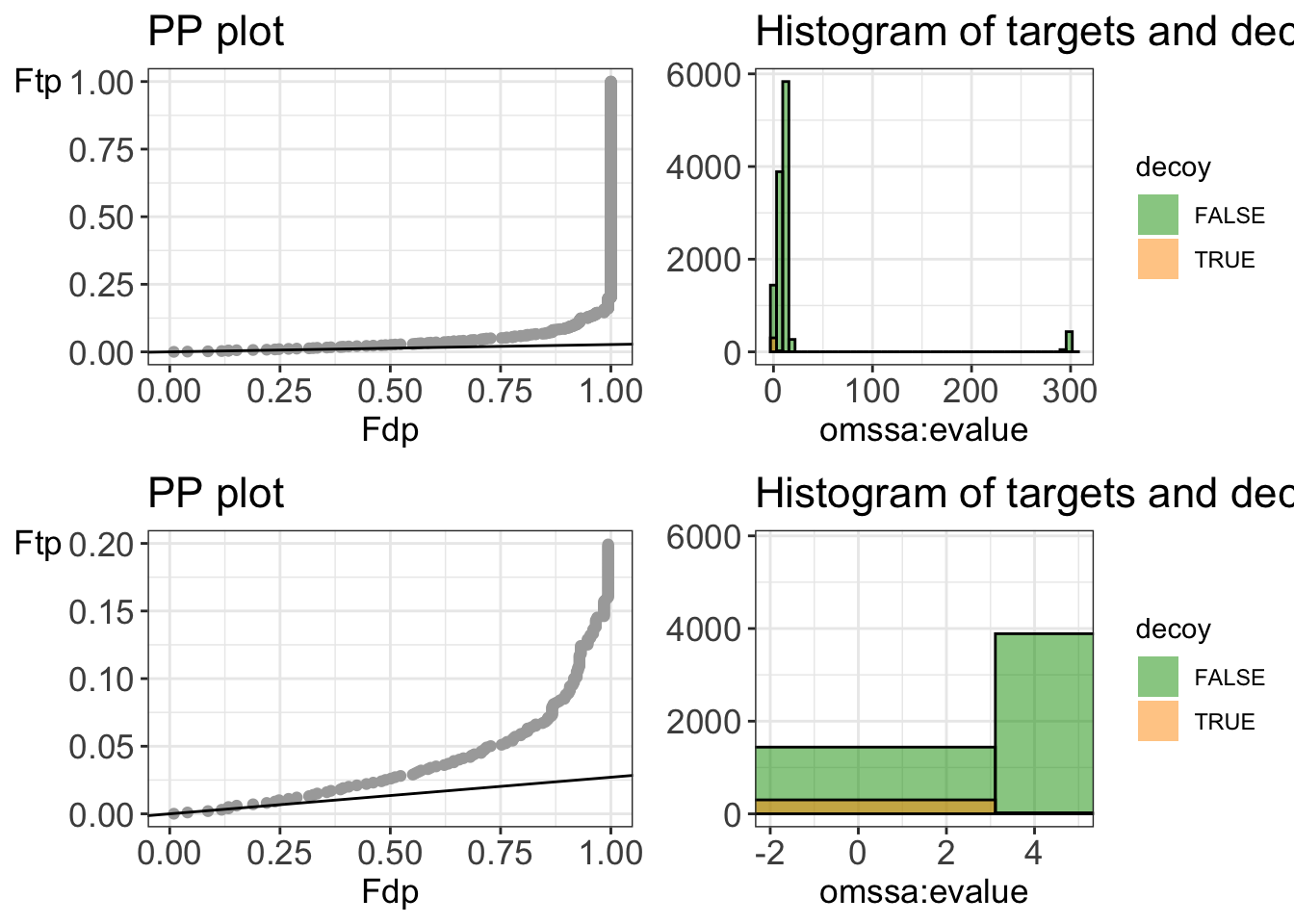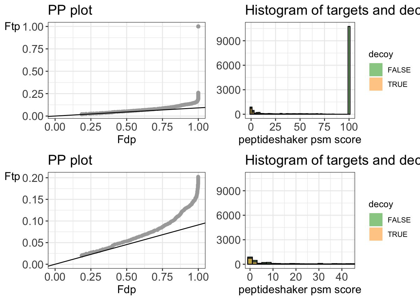 LS0tCnRpdGxlOiAiVHV0b3JpYWw6IEV2YWx1YXRlIHB5cm9jb2NjdXMgc2VhcmNoZXMgdXNpbmcgdW5pcHJvdCBhbmQgcGVwdGlkZSBzaGFrZXIiCmF1dGhvcjogCiAgLSBuYW1lOiBMaWV2ZW4gQ2xlbWVudAogICAgYWZmaWxpYXRpb246CiAgICAtIEdoZW50IFVuaXZlcnNpdHkKb3V0cHV0OiAKICAgIGh0bWxfZG9jdW1lbnQ6CiAgICAgIGNvZGVfZG93bmxvYWQ6IHRydWUKICAgICAgdGhlbWU6IGZsYXRseQogICAgICB0b2M6IHRydWUKICAgICAgdG9jX2Zsb2F0OiB0cnVlCiAgICAgIGhpZ2hsaWdodDogdGFuZ28KICAgICAgbnVtYmVyX3NlY3Rpb25zOiB0cnVlCmxpbmtjb2xvcjogYmx1ZQp1cmxjb2xvcjogYmx1ZQpjaXRlY29sb3I6IGJsdWUKLS0tCgojIExvYWQgTGlicmFyaWVzIAoKYGBge3J9CmxpYnJhcnkoVGFyZ2V0RGVjb3kpCmxpYnJhcnkoUkN1cmwpCmxpYnJhcnkobXpJRCkKYGBgCgojIERvd25sb2FkIGRhdGEgaW4gd29ya2luZyBkaXJlY3RvcnkKCmBgYHtyfQpkb3dubG9hZC5maWxlKCAKICB1cmwgPSAiaHR0cHM6Ly9yYXcuZ2l0aHVidXNlcmNvbnRlbnQuY29tL3N0YXRPbWljcy9QREEyMkdUUEIvZGF0YS9pZGVudGlmaWNhdGlvbi9weXJvVW5pcHJvdC5temlkIiwKICBkZXN0ZmlsZSA9ICJweXJvVW5pcHJvdC5temlkIgogICkKYGBgCgojIExvYWQgRGF0YSBpbiBSCgpgYGB7cn0KcGF0aDJGaWxlIDwtICJweXJvVW5pcHJvdC5temlkIgptemlkVW5pcHJvdCA8LSBteklEKHBhdGgyRmlsZSkKYGBgCgojIExhdW5jaCB0aGUgU2hpbnkgR2FkZ2V0IAoKRXhwbG9yZSB0aGUgcmVzdWx0cyBmb3Igc2VhcmNoIGVuaW5nZSBzY29yZXMgdG8gZmluZCBjb3JyZWN0IG5hbWVzIG9mIHNlYXJjaCBlbmdpbmUgc2NvcmVzIGluIHRoZSBteklELgoKYGBge3IgZXZhbD1GQUxTRX0KZXZhbFRhcmdldERlY295cyhtemlkVW5pcHJvdCkKYGBgCgojIEV2YWx1YXRlIHRhcmdldCBkZWNveSBhc3N1bXB0aW9ucyAKCiMjIFBlcHRpZGUgU2hha2VyCgpgYGB7cn0KZXZhbFRhcmdldERlY295cygKICBvYmplY3QgPSBtemlkVW5pcHJvdCwgCiAgZGVjb3kgPSAiaXNkZWNveSIsIAogIHNjb3JlID0gInBlcHRpZGVzaGFrZXIgcHNtIHNjb3JlIiwKICBsb2cxMCA9IEZBTFNFKQpgYGAKCldlIG9ic2VydmUgdGhhdCAKCi0gdGhlIGhpc3RvZ3JhbSBzaG93cyB0aGF0IFBlcHRpZGUgU2hha2VyIGdpdmVzIGEgdmVyeSBnb29kIHNlcGFyYXRpb24gYmV0d2VlbiBnb29kIHRhcmdldHMgYW5kIGJhZCB0YXJnZXRzLiAKCi0gdGhlIGhpc3RvZ3JhbSBhbmQgUFAgc2hvdyB0aGF0IHRoZSBkaXN0cmlidXRpb24gb2YgYmFkIHRhcmdldCBwZXB0aWRlc2hha2VyIFBTTSBzY29yZXMgaGF2ZSB0aGUgc2FtZSBkaXN0cmlidXRpb24gb2YgZGVjb3kgcGVwdGlkZXNoYWtlciBQU00gc2NvcmVzLgoKLSBUaGUgUFAtcGxvdCBzaG93cyB0aGF0IHRoZSByYXRpbyBvZiBkZWNveXMgb24gdGFyZ2V0cyBpcyBhIGdvb2QgZXN0aW1hdGUgb2YgdGhlIGV4cGVjdGVkIGZyYWN0aW9uIG9mIGJhZCB0YXJnZXQgaGl0cyB0aGF0IGFyZSByZXR1cm5lZCAoJFxoYXRccGlfYj1cZnJhY3tcIyBcdGV4dHtkZWNveXN9fXtcI1x0ZXh0e3RhcmdldHN9fSQgaXMgYSBnb29kIGVzdGltYXRlIG9mIHRoZSBmcmFjdGlvbiBvZiBiYWQgdGFyZ2V0IGhpdHMpLiBXZSBjYW4gdGh1cyBhc3N1bWUgdGhhdCBpdCBpcyBlcXVhbHkgbGlrZWx5IHRoYXQgYSBiYWQgUFNNIGhpdCB3aWxsIG1hdGNoIHRvIGEgdGFyZ2V0IHNlcXVlbmNlIG9yIGEgZGVjb3kgc2VxdWVuY2UuICAKCi0gSXQgaXMgbm90IHJlYWxseSByZXF1aXJlZCB0byBhc3Nlc3MgdGhlIGFzc3VtcHRpb25zIG9mIHRoZSBzZWFyY2ggZW5naW5lcyB1c2VkIGJ5IHBlcHRpZGUgc2hha2VyIGJlY2F1c2UgdGhlcmUgYXJlIG5vIHByb2JsZW1zLiAKCi0gRm9yIGNvbXBsZXRlbmVzcyB3ZSBzdGlsbCBldmFsdWF0ZSB0aGUgZGlmZmVyZW50IHNlYXJjaCBlbmdpbmVzIHVzZWQgYnkgcGVwdGlkZSBzaGFrZXIuIAoKIyMgTVNHRisKCgpgYGB7cn0KZXZhbFRhcmdldERlY295cygKICBvYmplY3QgPSBtemlkVW5pcHJvdCwgCiAgZGVjb3kgPSAiaXNkZWNveSIsIAogIHNjb3JlID0gIm1zLWdmOnNwZWNldmFsdWUiLAogIGxvZzEwID0gVFJVRSkKYGBgCgotIFRoZSBwbG90cyBzaG93IHRoYXQKdGhlIGRpc3RyaWJ1dGlvbiBvZiB0aGUgTVNHRisgUFNNIHNjb3JlcyBhcmUgbmljZWx5IGJpbW9kYWwuIAoKLSBUaGUgc2VwYXJhdGlvbiBiZXR3ZWVuIGdvb2QgdGFyZ2V0IFBTTSBzY29yZXMgYW5kIGJhZCB0YXJnZXQgUFNNIHNjb3JlcyBpcyBsZXNzIHByb25vdW5jZWQgdGhhbiBmb3IgcGVwdGlkZSBzaGFrZXIuIFNvIGl0IGlzIGJlbmVmaWNpYWwgdG8gaW5jbHVkZSB0aGUgb3RoZXIgZW5naW5lcyB3aXRoIHBlcHRpZGVzaGFrZXIuIAoKLSBXZSBkbyBub3Qgc2VlIGRldmlhdGlvbnMgZnJvbSB0aGUgdGFyZ2V0IGRlY295IGFzc3VtcHRpb25zLiAKCiMjIE9tc3NhCgpgYGB7cn0KZXZhbFRhcmdldERlY295cygKICBvYmplY3QgPSBtemlkVW5pcHJvdCwgCiAgZGVjb3kgPSAiaXNkZWNveSIsIAogIHNjb3JlID0gIm9tc3NhOmV2YWx1ZSIsCiAgbG9nMTAgPSBUUlVFKQpgYGAKCgotIFRoZSBzZXBhcmF0aW9uIGJldHdlZW4gZ29vZCB0YXJnZXQgUFNNIHNjb3JlcyBhbmQgYmFkIHRhcmdldCBQU00gc2NvcmVzIGlzIGxlc3MgcHJvbm91bmNlZCBmb3Igb21zc2EgdGhhbiBmb3IgcGVwdGlkZSBzaGFrZXIuIFNvIGl0IGlzIGJlbmVmaWNpYWwgdG8gaW5jbHVkZSB0aGUgb3RoZXIgZW5naW5lcyB3aXRoIHBlcHRpZGVzaGFrZXIuIAoKLSBXZSBkbyBub3Qgc2VlIGRldmlhdGlvbnMgZnJvbSB0aGUgdGFyZ2V0IGRlY295IGFzc3VtcHRpb25zLiAKCiMjIFghVGFuZGVtCgpgYGB7cn0KZXZhbFRhcmdldERlY295cygKICBvYmplY3QgPSBtemlkVW5pcHJvdCwgCiAgZGVjb3kgPSAiaXNkZWNveSIsIAogIHNjb3JlID0gInghdGFuZGVtOmV4cGVjdCIsCiAgbG9nMTAgPSBUUlVFKQpgYGAKCgotIFRoZSBzZXBhcmF0aW9uIGJldHdlZW4gZ29vZCB0YXJnZXQgUFNNIHNjb3JlcyBhbmQgYmFkIHRhcmdldCBQU00gc2NvcmVzIGlzIGxlc3MgcHJvbm91bmNlZCBmb3IgWCFUYW5kZW0gdGhhbiBmb3IgcGVwdGlkZSBzaGFrZXIuIFNvIGl0IGlzIGJlbmVmaWNpYWwgdG8gaW5jbHVkZSB0aGUgb3RoZXIgZW5naW5lcyB3aXRoIHBlcHRpZGVzaGFrZXIuIAoKLSBUaGUgZGVjb3kgUFNNIHNjb3JlIGRpc3RyaWJ1dGlvbiBoYXMgdGhlIHNhbWUgc2hhcGUgYXMgdGhlIFBTTSBzY29yZSBkaXN0cmlidXRpb24gb2YgYmFkIHRhcmdldHMuIAoKLSBUaGVyZSBzZWVtcyB0byBiZSBzb21lIGV2aWRlbmNlIHRoYXQgYmFkIFBTTSBoaXRzIGFyZSBtb3JlIGxpa2VseSB0byBnbyB0byB0YXJnZXQgdGhhbiB0byBkZWNveSBzZXF1ZW5jZXMuIEhvd2V2ZXIsIHRoaXMgZG9lcyBub3QgbGVhZCB0byBwcm9ibGVtcyB3aGVuIGNvbWJpbmluZyBYIXRhbmRlbSB3aXRoIG90aGVyIGVuZ2luZXMgaW4gcGVwdGlkZSBzaGFrZXIuIAo=