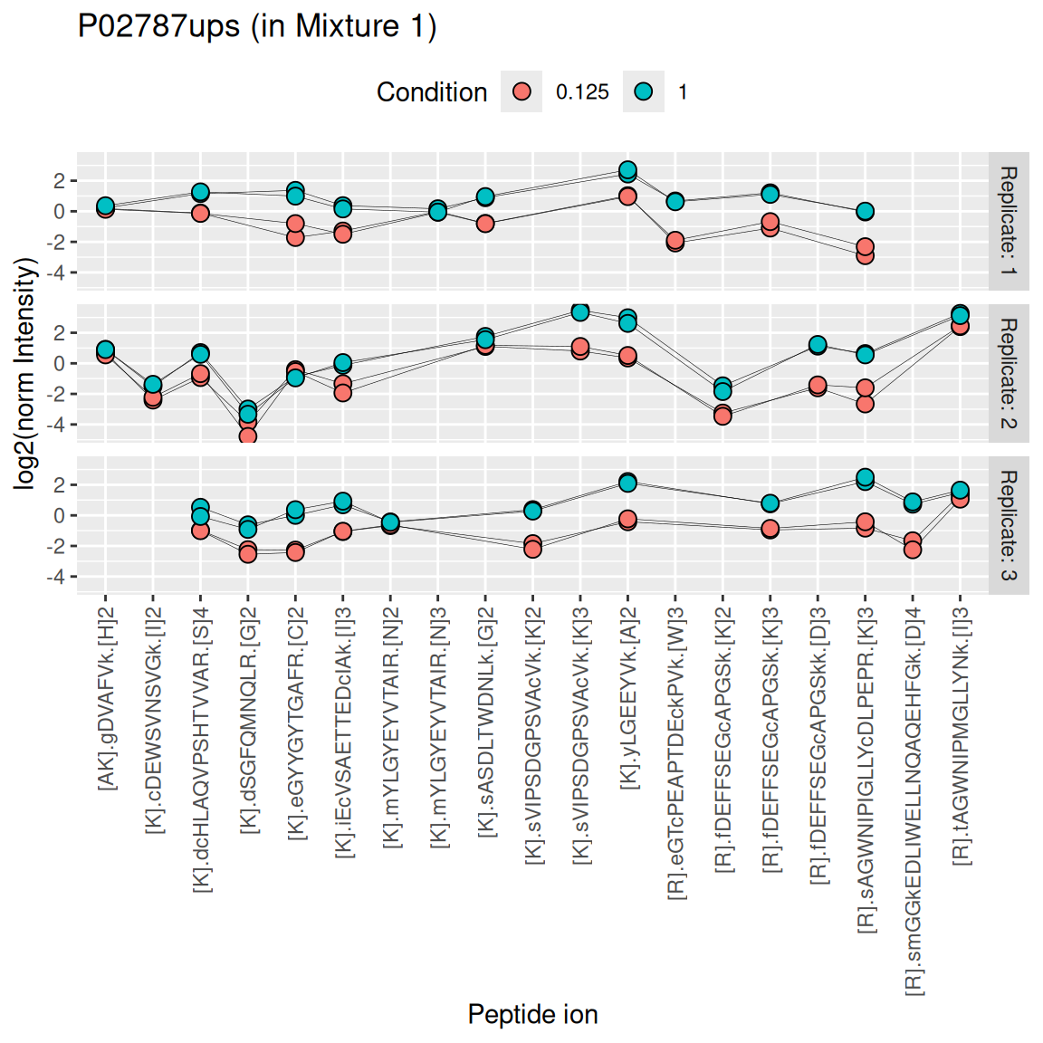 The data set used in this chapter is a spike-in experiment (PXD0015258) published by Huang et al. (2020). It consists of controlled mixtures with known ground truth. UPS1 peptides at concentrations of 500, 333, 250, and 62.5 fmol were spiked into 50 g of SILAC HeLa peptides, each in duplicate. These concentrations form a dilution series of 1, 0.667, 0.5, and 0.125 relative to the highest UPS1 peptide amount (500 fmol). A reference sample was created by combining the diluted UPS1 peptide samples with 50g of SILAC HeLa peptides. All dilutions and the reference sample were prepared in duplicate, resulting in a total of ten samples. These samples were then treated with TMT10-plex reagents and combined before LC-MS/MS analysis. This protocol was repeated five times, each with three technical replicates, totaling 15 MS runs.