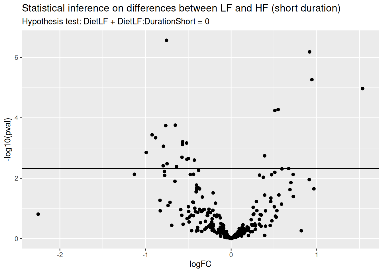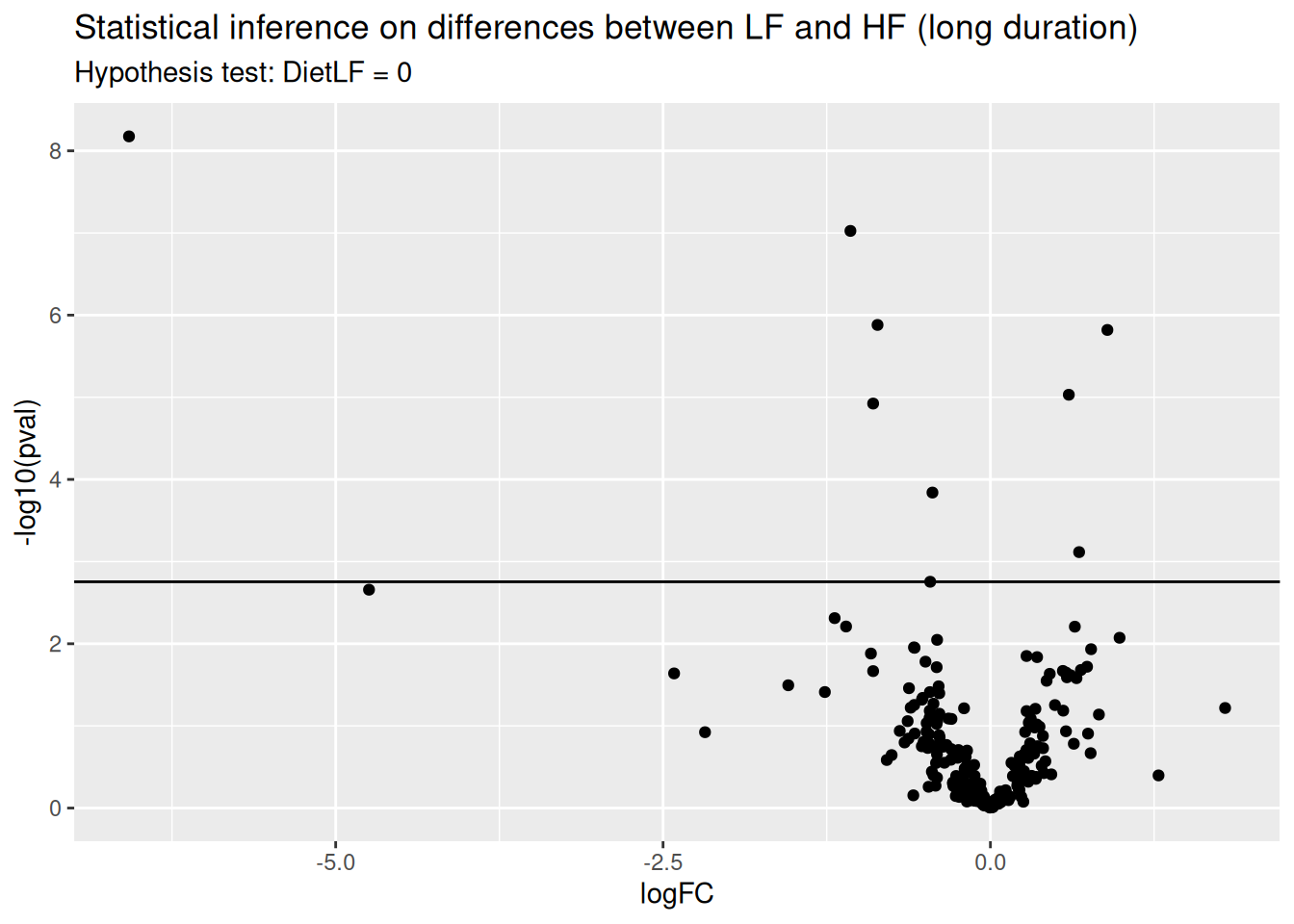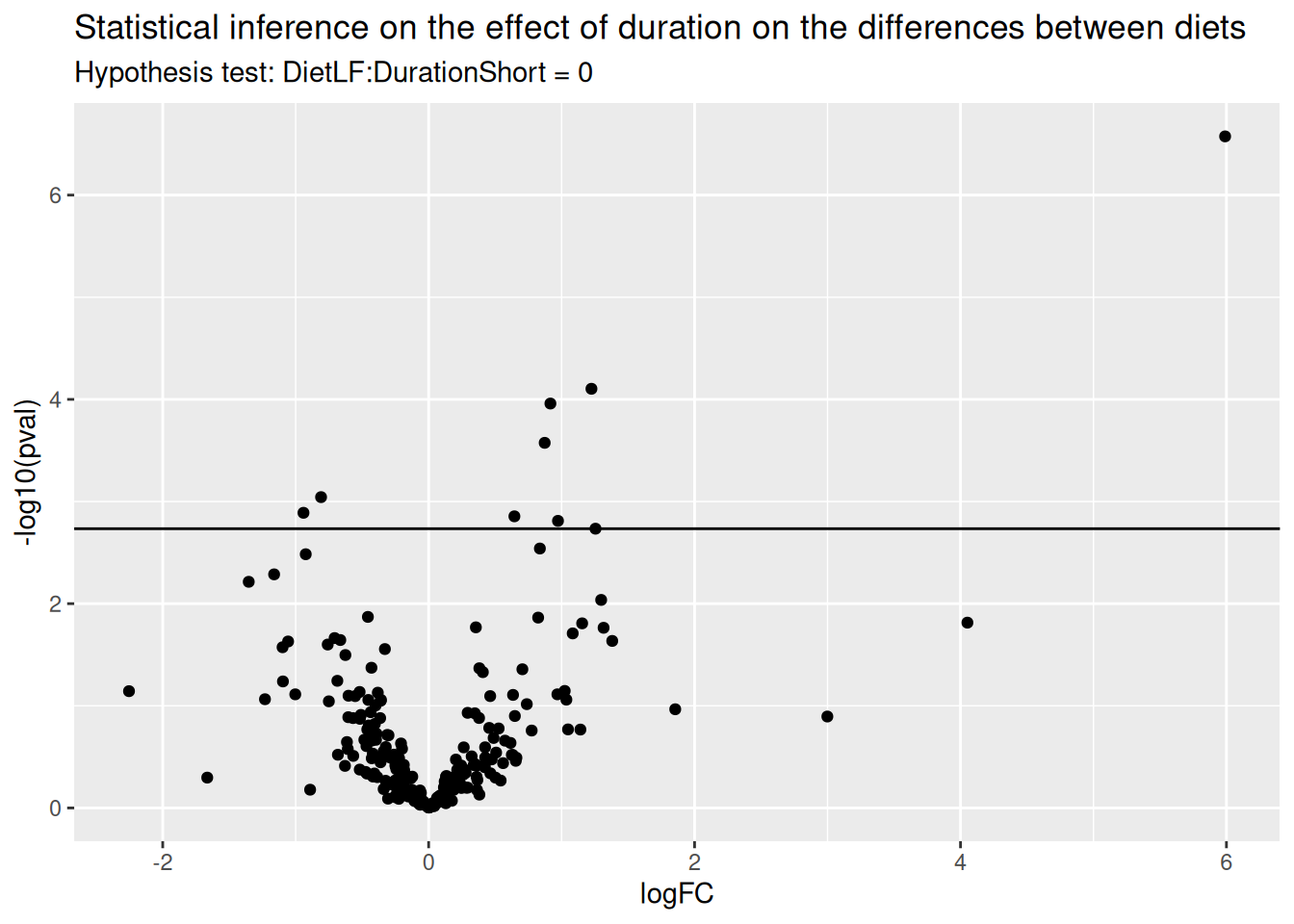 Again, only a few proteins come out differentially abundant between the two diets, but after a long diet duration.