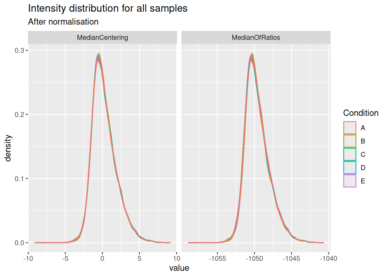 )However, other methods exist, median centering being the most popular. Median centering normalisation subtracts the median intensity of each sample from all its measurements. A key assumption for this method is that the majority of proteins are not differentially abundant. We abbreviate this method as the MedianCentering method. The norm factor used by MedianOfRatios is estimated as follows: