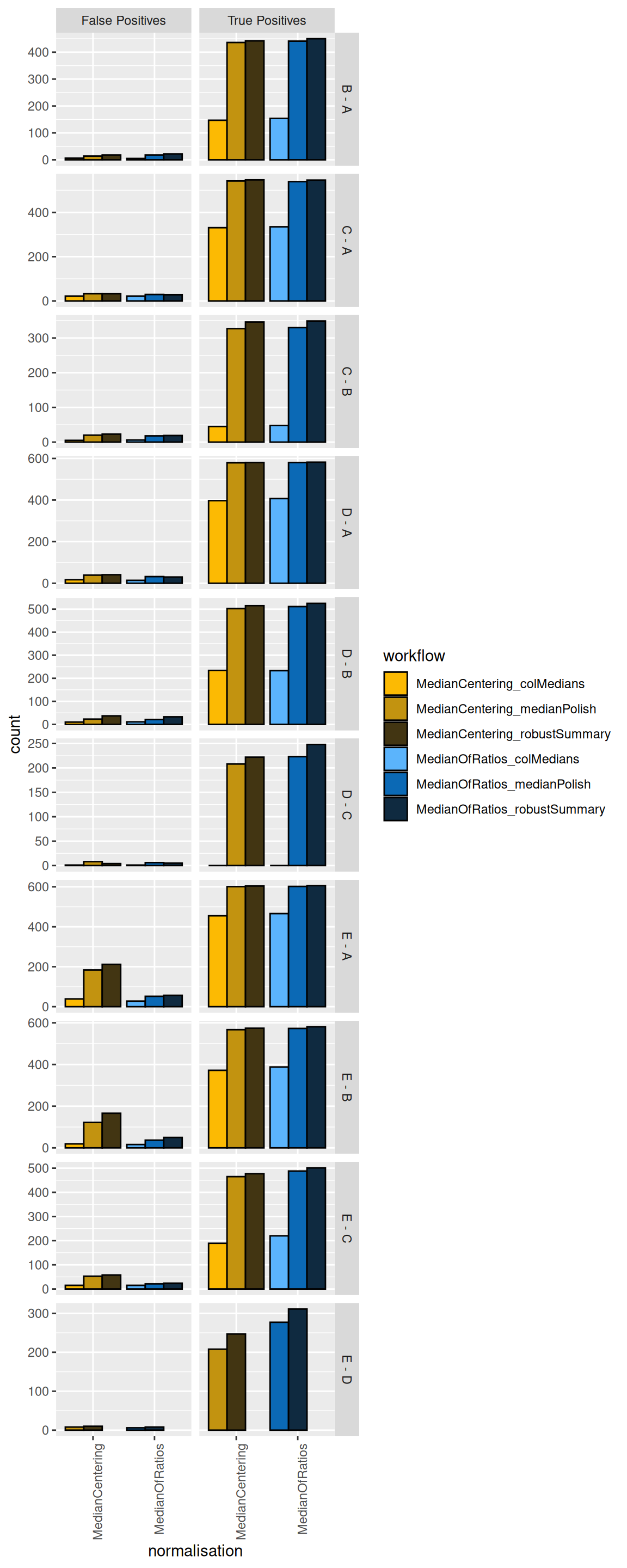 We see that, while it has minimal impact on the TPs, the median centering normalisation approach increases the number of FPs for some comparisons (E-A and E-B). We therefore suggest to use the Median of ratio’s normalisation method.