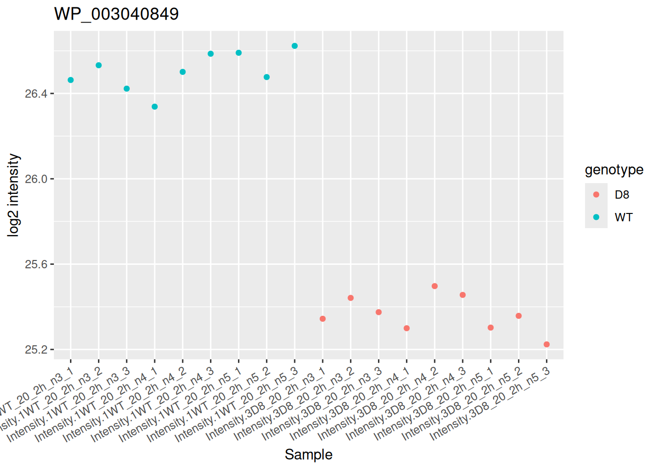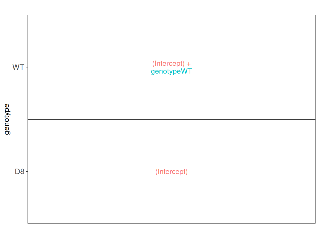 This plot shows that the average \(\log_2\) protein intensity for the D8 group is modelled by (Intercept), and the the average \(\log_2\) protein intensity for the WT group is modelled by (Intercept) + genotypeWT.