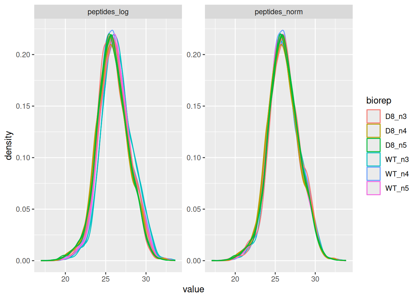 name = "peptides_norm") #4. Subtract log2 norm factor column-by-column (MARGIN = 2)Upon the normalisation the density curves should be nicely centred. To confirm this, we will plot the intensity distributions for each biorepeat (francisella culture). longForm() seamlessly combines the quantification and annotation data into a table suitable for ggplot2 visualisation. We also subset the object with the data before and after normalisation.