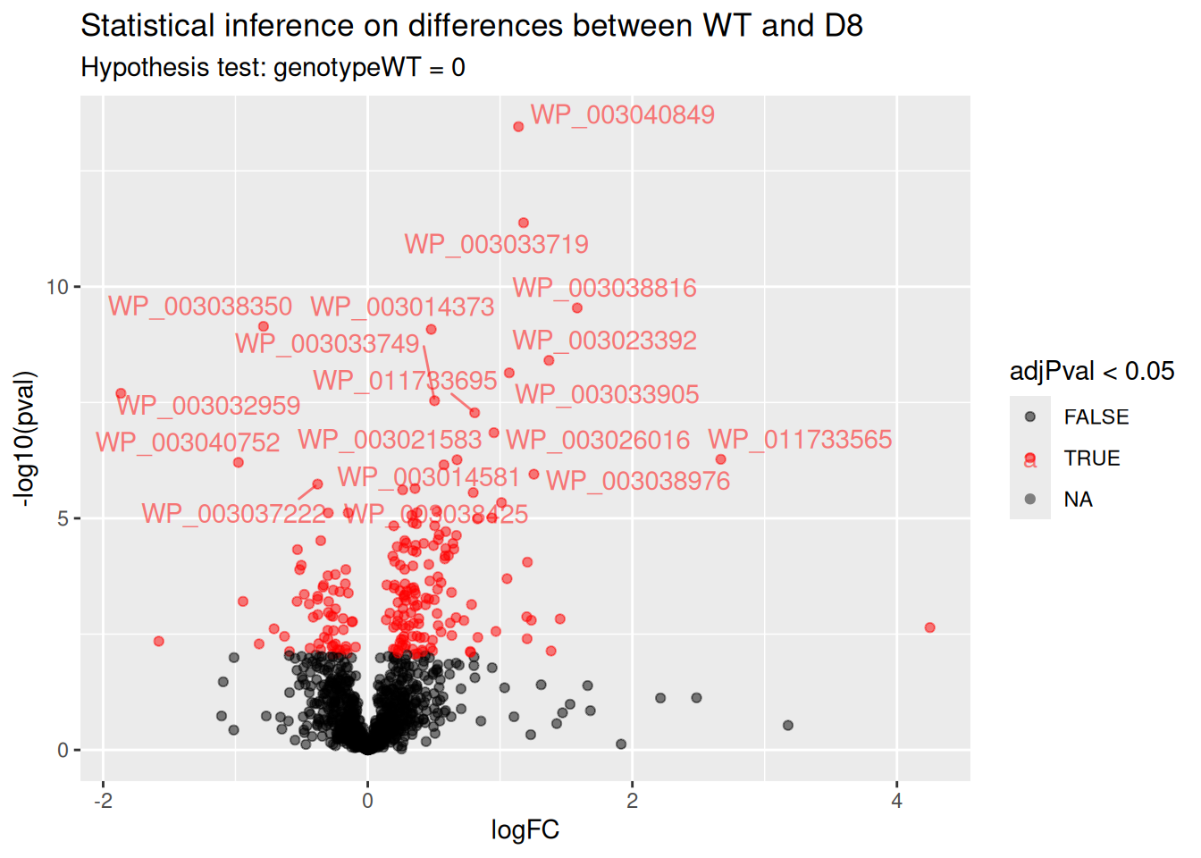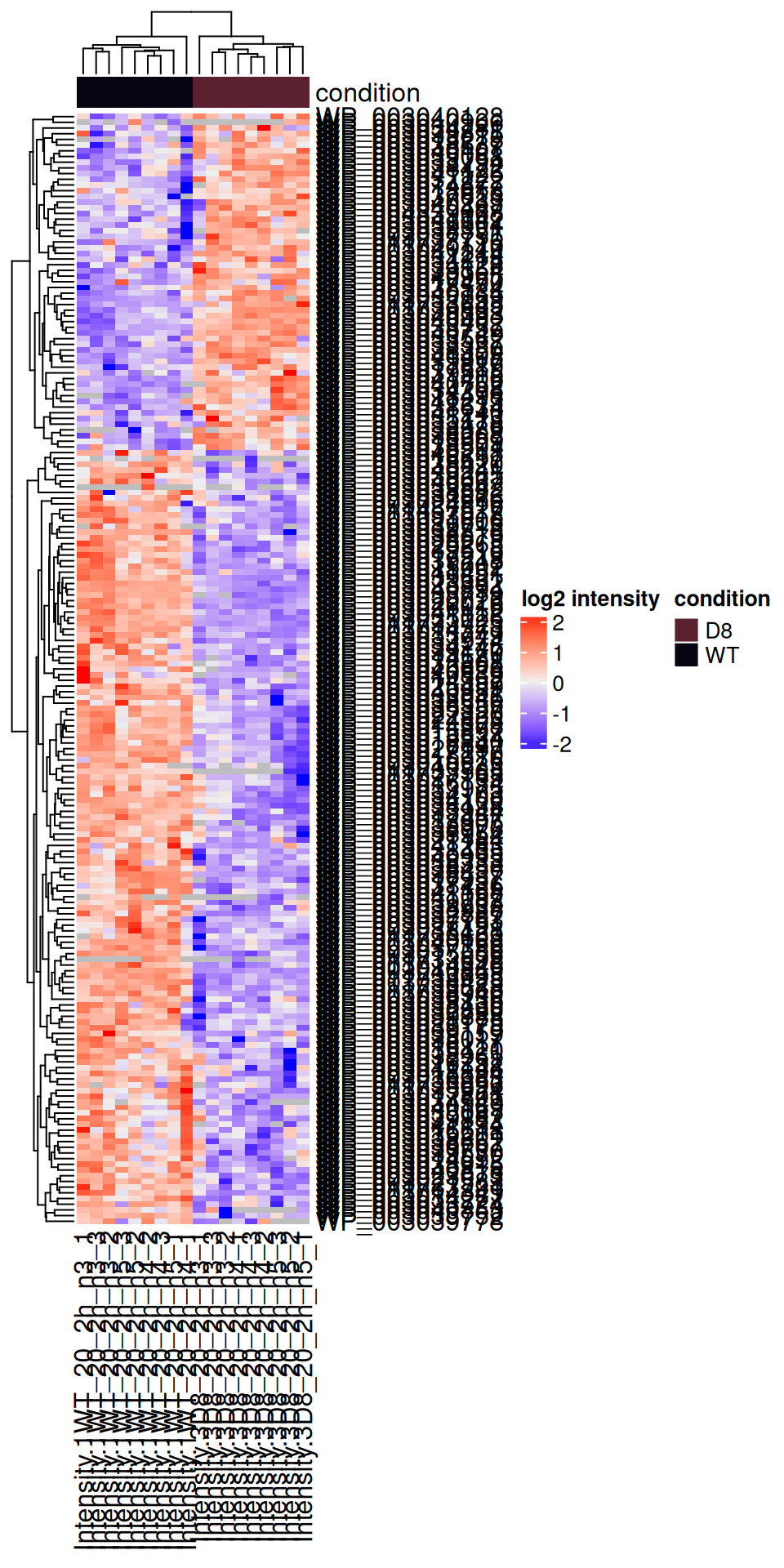 We can also build a heatmap for the significant proteins which are obtained by filtering the inference table. We first retrieve the data with proteins that are differentially abundant between the WT and the D8 genotype.