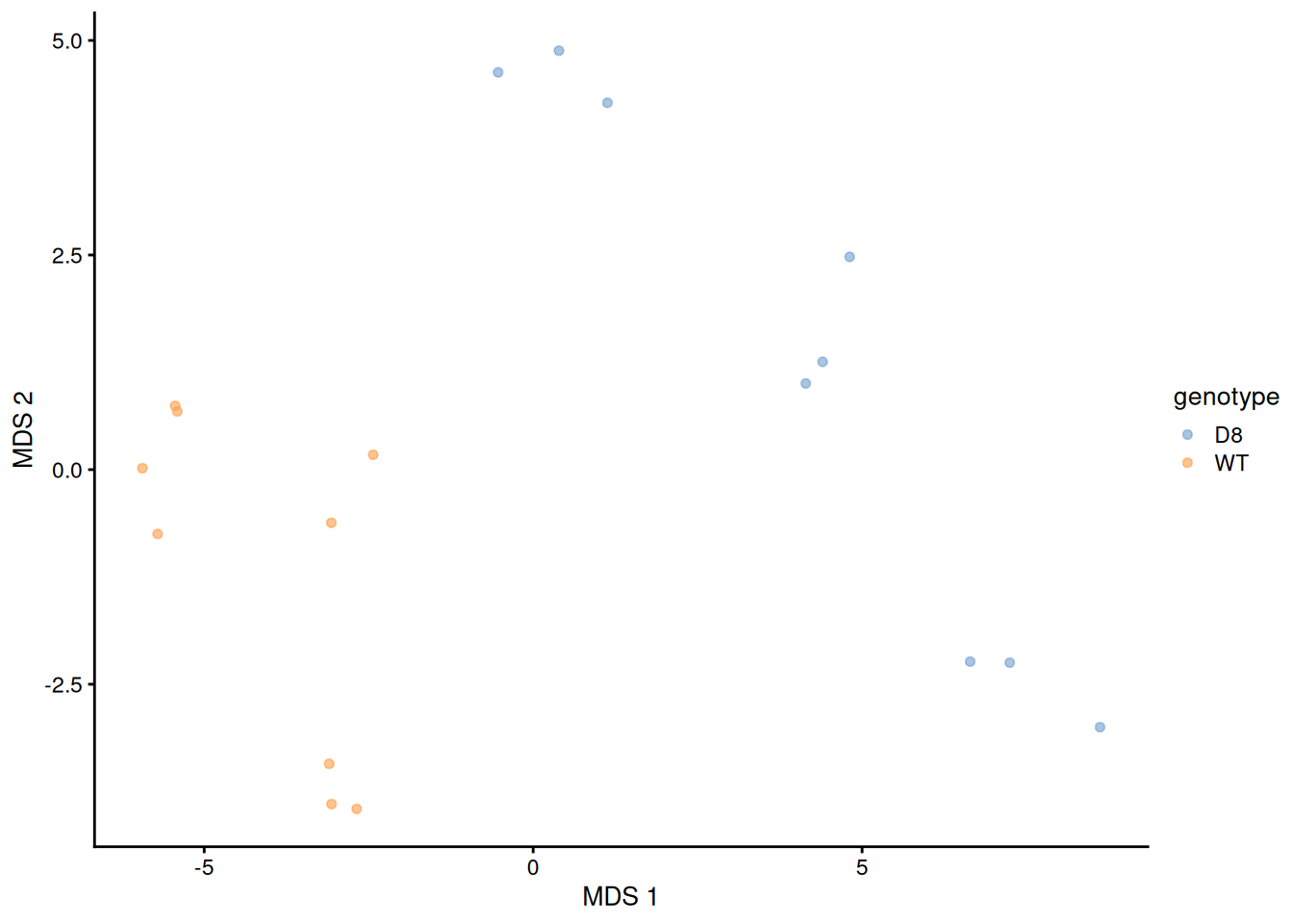 Note, that we cannot use ridge regression here to further stabilize the parameter estimation of the fixed effects. Ridge regression typically performs better the more slope parameters there are in the mean model (more complex designs). Here, the fixed effect consists of the genotype: knockout (D8) vs wild type (WT). By default the first group (D8) will become the reference group and its effect will be absorbed in the intercept of the model. Hence, only a single slope term is needed to model the average difference between D8 and WT (See Section Statistical inference below).