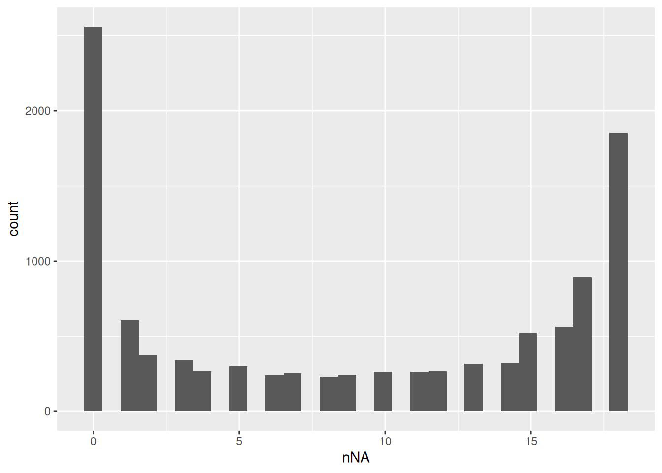 Note, that in experiments without technical repeats we filter on the number of samples in which a peptide is picked up (this is typically performed using filterNA()). Here, we will require that a peptide is picked up in at least two biorepeats. We compute the number of biorepeats that were observed for each peptide (that is the number of biorepeats that contain at least one observed value).